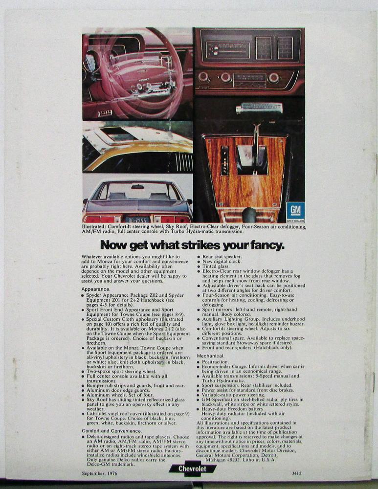 Original, 1977 color, sales brochure for the Chevrolet Monza (2+2, Hatchback, Spyder, Coupe). Good condition.