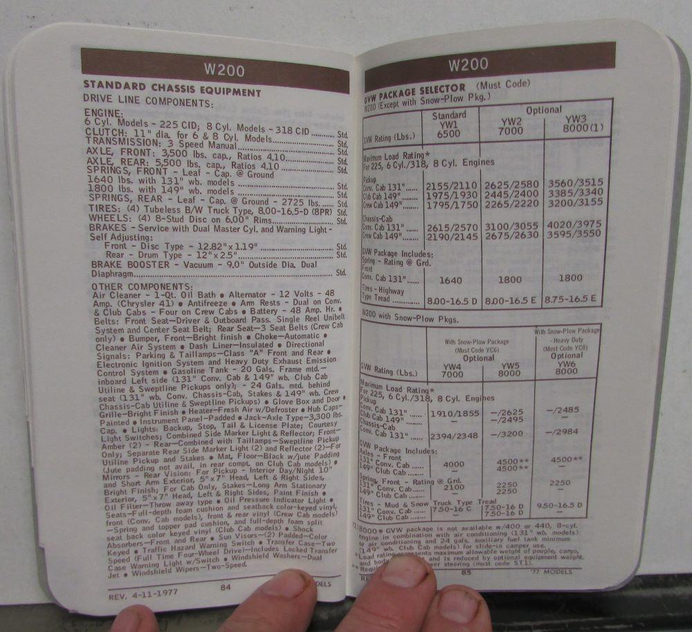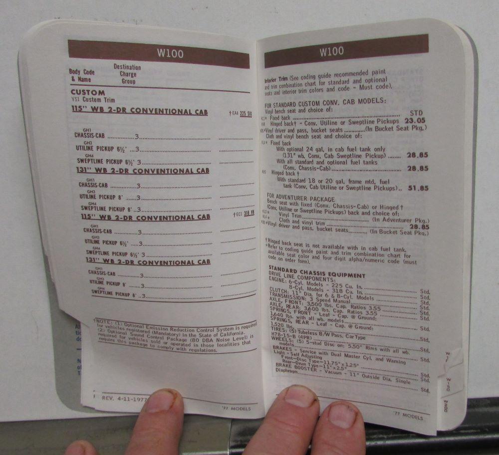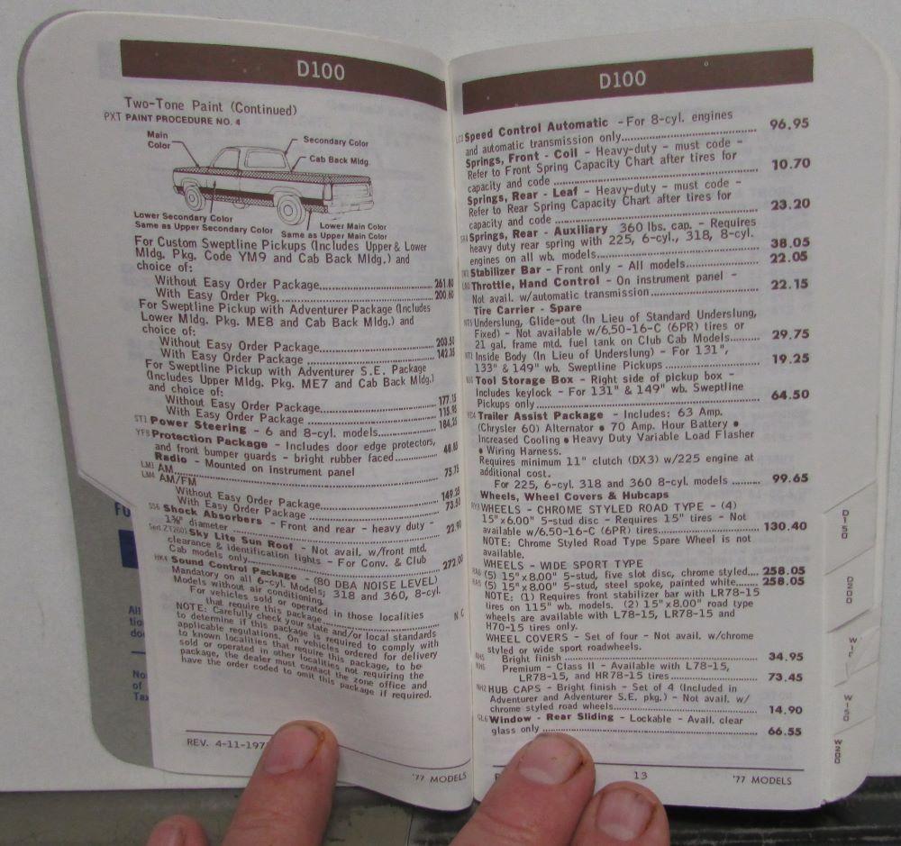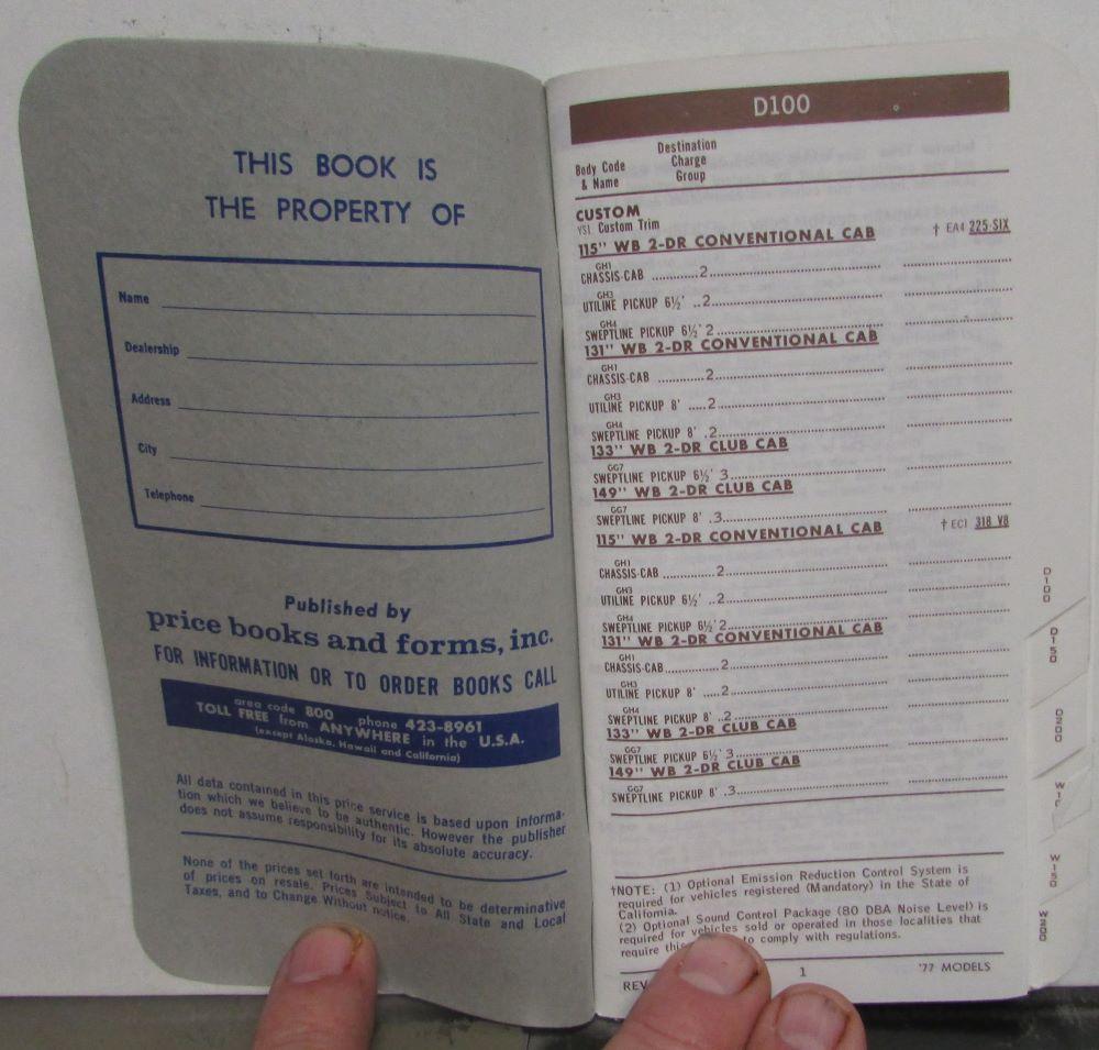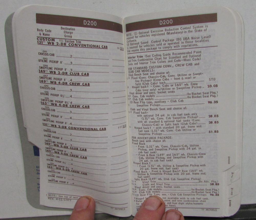 Original 1977 Dodge Dealer Salesmen's Pocket Price Book. This small Data Book covers the Pricing, Options and Data on the following Truck Models: D100, D150, D200, W100, W150, W200. Very hard to find and informative booklet for the Dodge Truck Owner that is in good condition with minor wear [see photos].