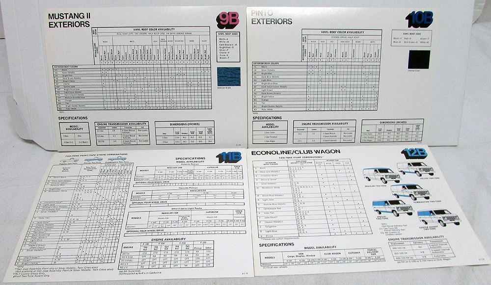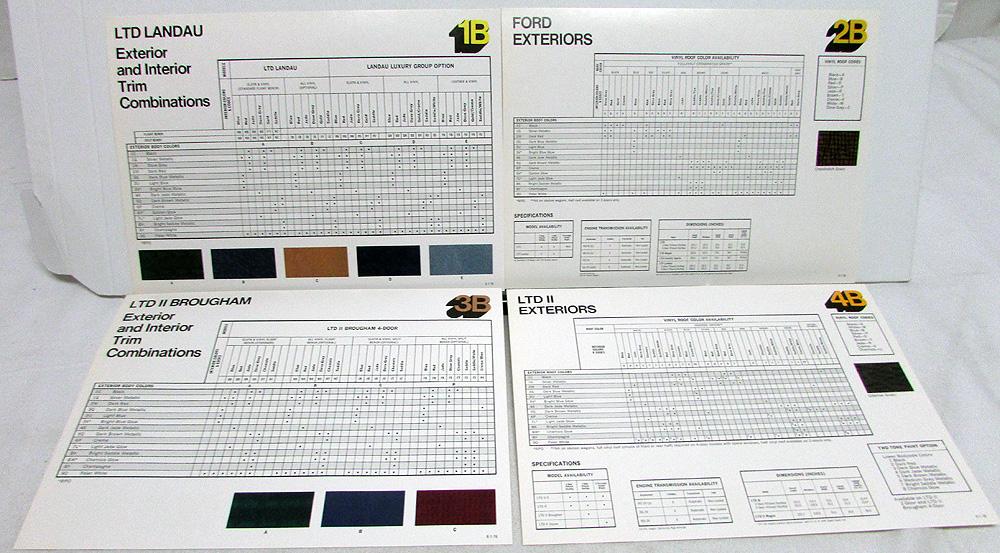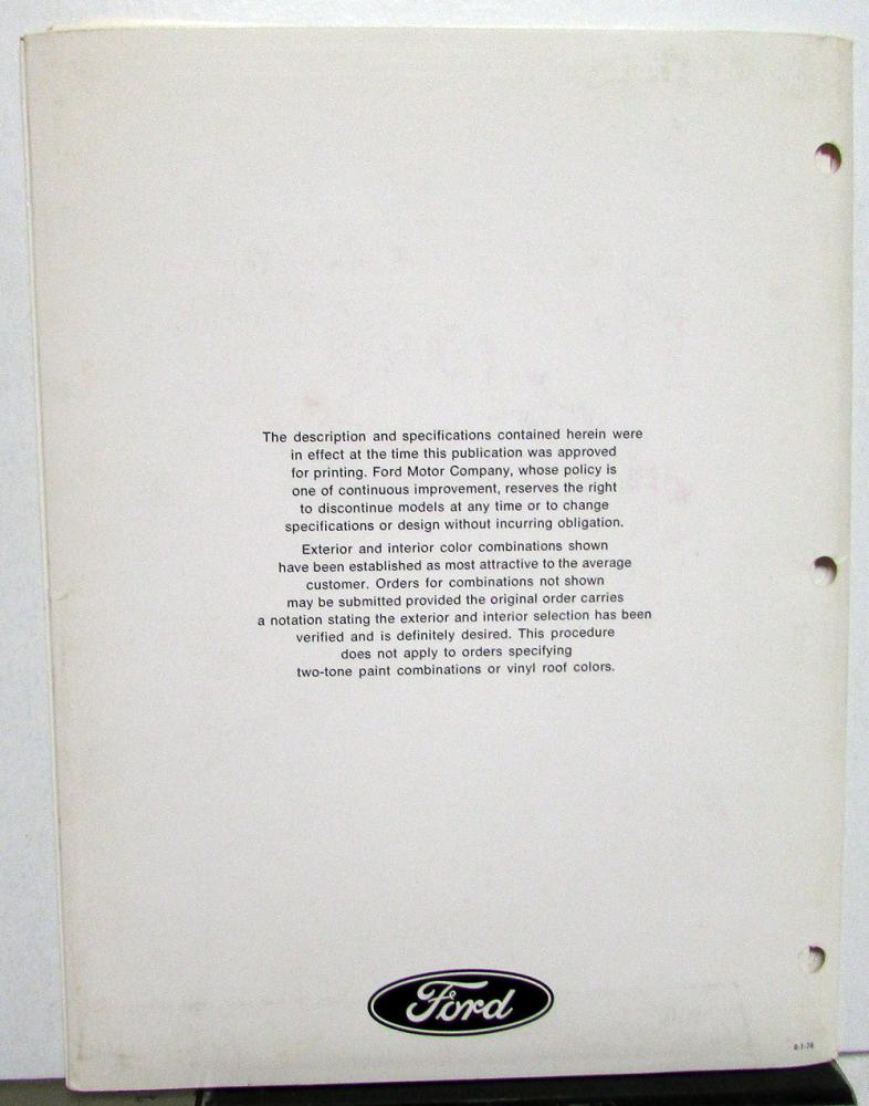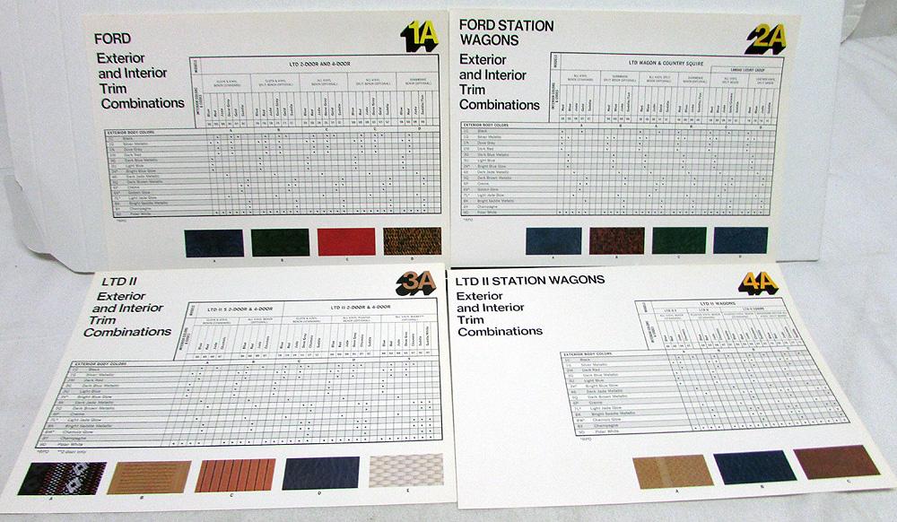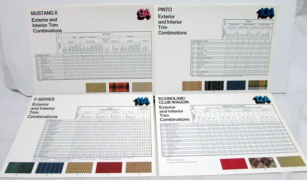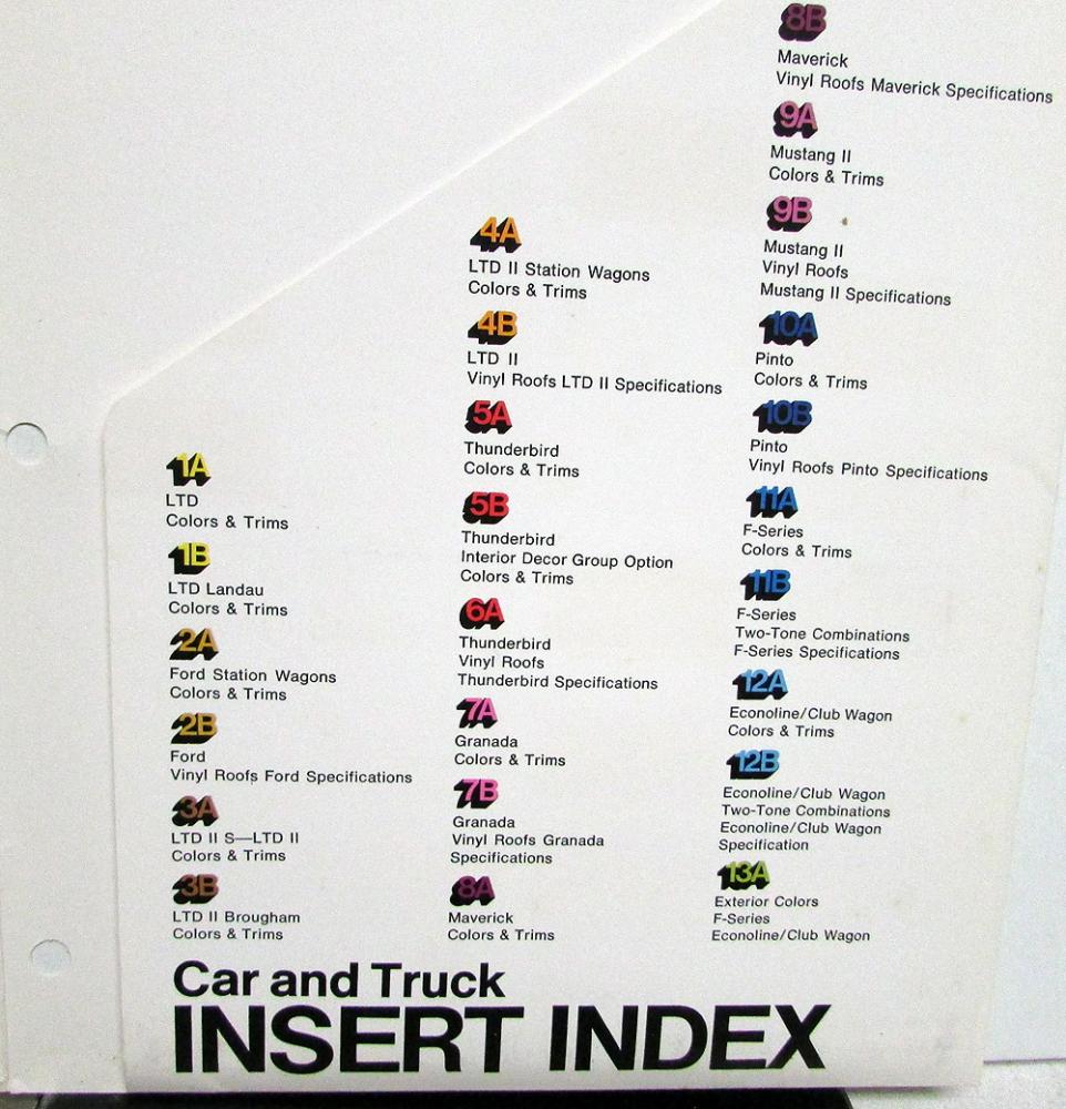 Original 1977 Ford Dealer Color & Upholstery Guides Portfolio for Cars and Trucks. The Folder has Exterior Color Paint Chips and holds Inserts that highlight the Colors and Trims options for the Full Line of Ford Models. Portfolio is missing Card 13A [Exterior Colors F-Series, Econoline/Club Wagon]. Portfolio Folder has some soiling on cover, Cards are very good with minor wear [see photos].