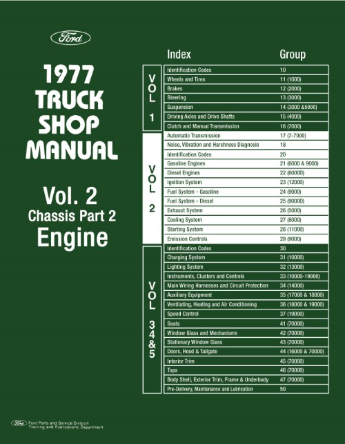 This 1977 Ford Truck Shop Manual (5 Vol) licensed reproduction provides the most comprehensive repair information in paper format available on the market. This new printed manual is reproduced using the highest quality scanner and digital printer available - shrink wrapped and ready to be shipped to your location. This OEM repair / service manual reproduction provides detailed repair and service procedures for all vehicle subsystems.The 1977 Ford Truck Shop Manual (5 Vol) is a high quality reproduction of the exact manual originally published by the TRUCK manufacturer to be used by their dealer mechanics. Each manual contains detailed service / repair / rebuild procedures, specifications, diagrams, photos, charts, diagnostic and troubleshooting information for all major subsystem components such as:Chassis - Volume 1Index and Identification CodesWheels and TiresBrakesSteeringSuspensionDriving Axles and DriveshaftClutch and Manual TransmissionsAutomatic TransmissionEngine - Volume 2Index and Vehicle IdentificationGasoline EnginesDiesel EnginesIgnition SystemFuel Systems - GasolineFuel Systems - DieselExhaust SystemsCooling SystemStarting SystemEmissions ControlsElectrical - Volume 3Index and Truck Identification CodesCharging SystemLighting SystemInstruments, Clusters and ControlsMain Wiring Harnesses and Circuit ProtectionAuxiliary Equipment: Radio, Stereo, Windshield Wiper and Washer, Lighters, Ash Receptacles, Mirrors, Etc.Ventilating, Heating and Air ConditioningBody - Volume 4Index and IdentificationSeatsWindow Glass and MechanisimsStationary Window GlassDoors, Hood, and TailgateInterior TrimTopsBody Shell, Exterior Trim, Frame, UnderbodyPre-Delivery, Maintenance and Lubrication - Volume 5Index and IdentificationPre-Delivery Sequence GuidesMaintenance ScheduleLubricationPre-Delivery and Maintenance Procedures NOTE: Specifications at the end of each chapter/group.MANUAL SPECIFICATIONS:OEM Part Number: FPS 365-127-77A, FPS 365-127-77B, FPS 365-127-77C, FPS 365-127-77DBinding: Paperback - 8.5 x 11 inchesPages: 2858 - with thousands of photos and diagrams in black & white Publisher: Ford Motor Company / Reproduced Under License : 50# Paper Acid & Clorine Free, FSC (Forest Stewardship Council) Certified, Rainforest Alliance Certified