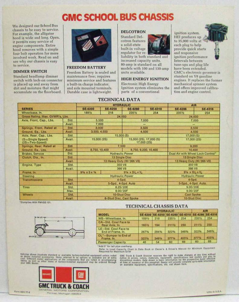 1977 GMC Trucks School Bus Chassis SE-6200 SE-6250 SE-6280 SE-6310 SE-6286 SE-6316 Spec Sheet.