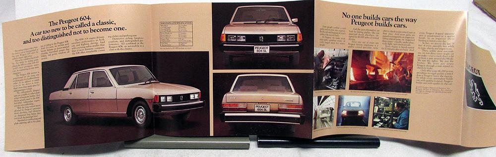 Original 1977 Peugeot Dealer Sales Brochure. This Folder highlights the 504 and 604 Models. It is in good condition with minor wear [see photos].