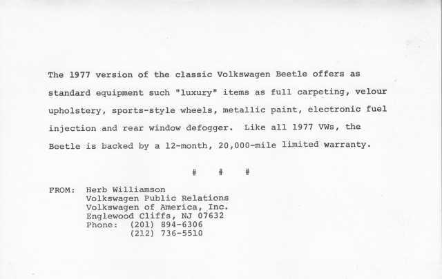1977 VW Volkswagen Beetle Bug Press Photo and Press Release.