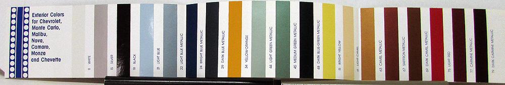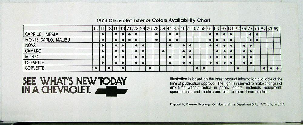 Original, 1978 Chevrolet Exterior Colors (paint chips) for the Caprice, Impala, Monte Carlo, Malibu, Nova, Camaro, Monza, Chevette, and Corvette. Vinyl color chart, and list of car/color availabilities. Double sided printing on one sheet of paper with multiple folds. Good condition.