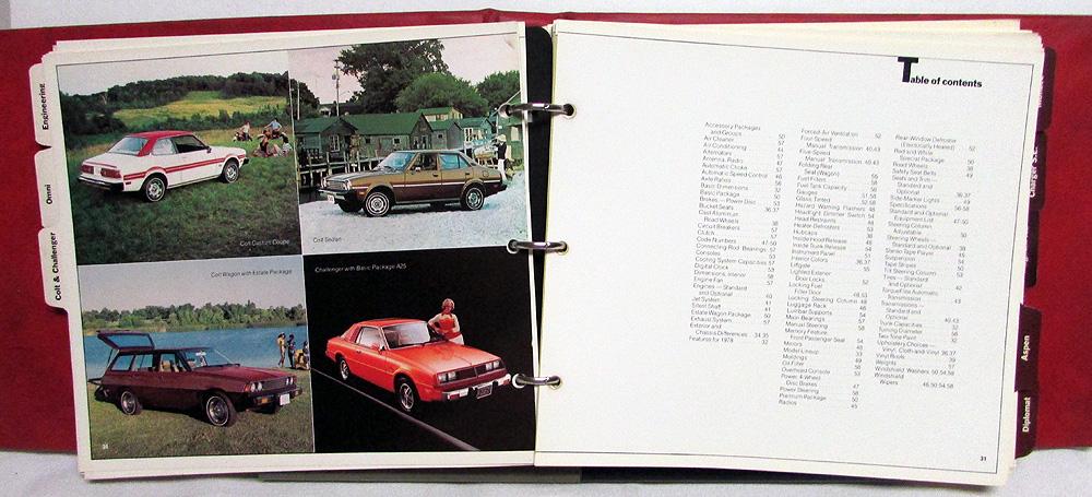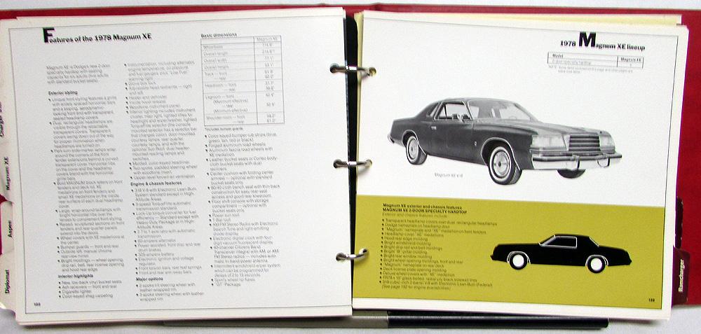 This is an original 1978 Dodge Data Book. It is in good condition for its age, see photos for reference, and was put together to be an easily accessible resource for the salesmen to reference when it came to answering the customers' questions, helping them place an order, or to help promote the model year line. Included are very nice, colorful photos, model lineup, seating options, options, packages, ordering codes, and much more for the Colt, Challenger, Omni, Aspen, Diplomat, Magnum XE, Monaco, Charger SE, Sportsman, and Ramcharger.