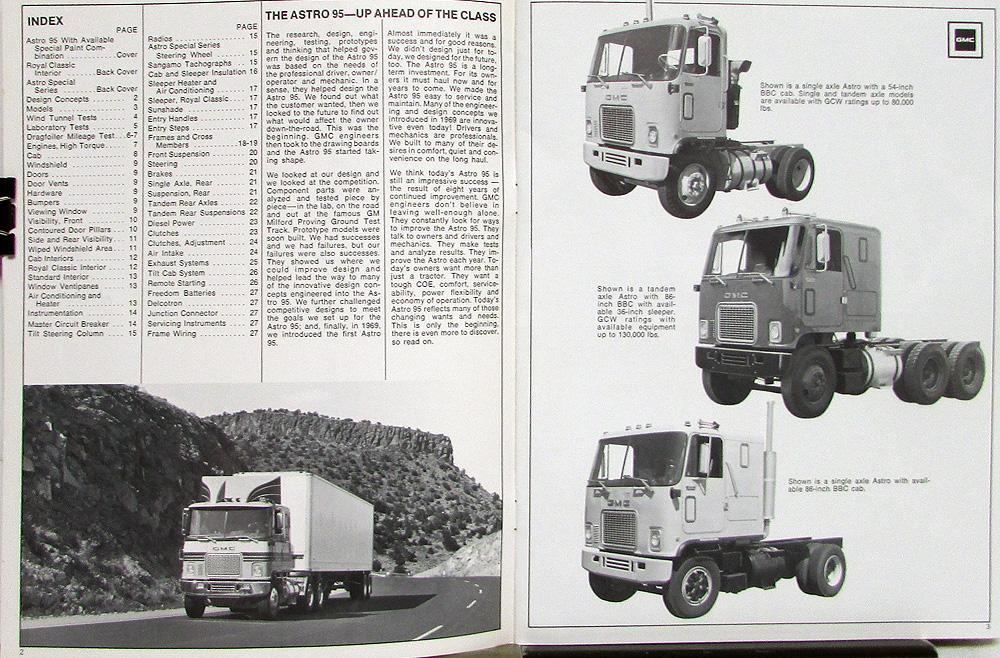 Original sales brochure for the 1978 GMC Astro 95 big truck. See index in photo. Read about Dragfoiler, cab, visibility, control center, cab comforts, sleeper compartments, frame, performance, engines, components, and more. No specs. Form ADV 78-15.