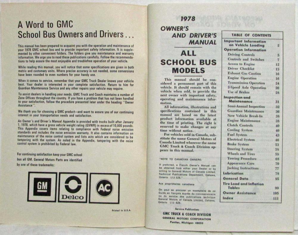 This manual was prepared to acquaint you with the operation and maintenance of your 1978 GMC School Bus and to provide important safety information.