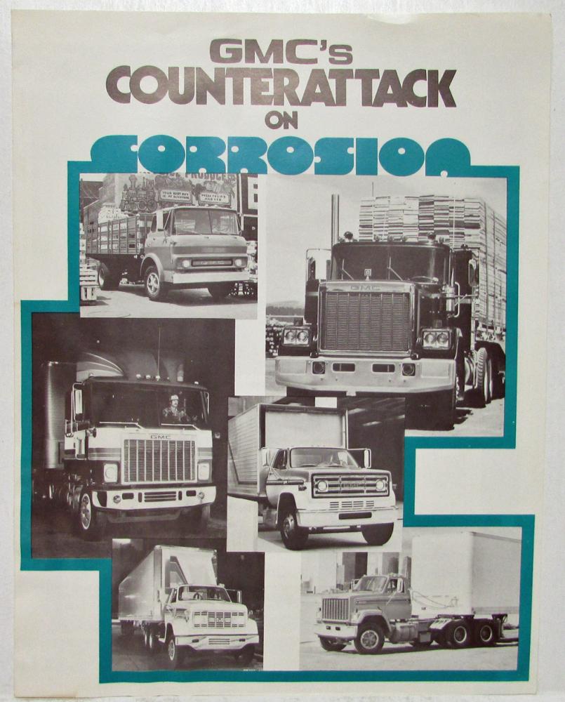 1978 GMC Trucks Counterattack on Corrosion Sales Folder. How GMC fights corrosion. Cathodic Elpo Dip Process used on GMC Medium and Heavy Duty cabs and doors is shown. GMC's Extensive Anti-Corrosion Program. GMC is continually improving its anti-corrosion program. The result is a truly impressive anti-corrosion system for all '78 GMC Medium and Heavy Duty Trucks. The First Big Step - Cathodic Elpo Dip. Many Fasteners Get Anti-Corrosion Treatments as well. The list of items for various models is listed on pages 3 and 4. Condition: Wrinkling from exposure to moisture and some staining. See pics.