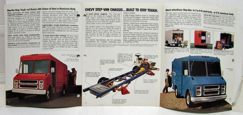 1979 Chevrolet Walk-In Vans Sales Folder. Step-Van King: Tough and Roomy with Choice of Steel or Aluminum Body. Short Wheelbase Step-Van in 7 or 8 ft steel bodies or 8ft aluminum bodies. Back has specifications.