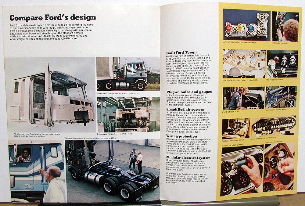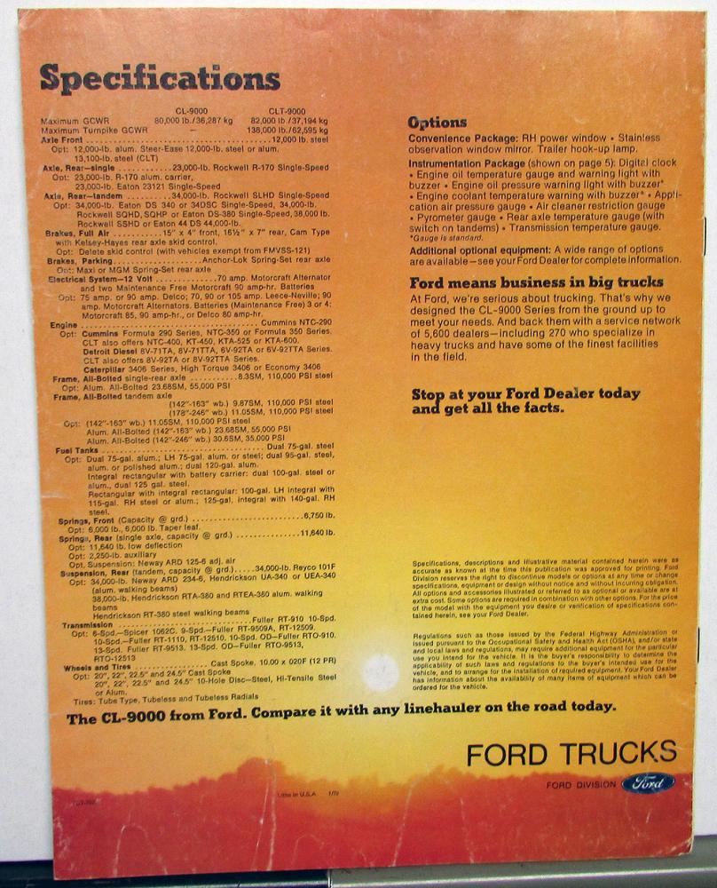 Original color, sales brochure for the 1979 Ford CL9000 heavy duty linehauler and CLT9000. Lots of photos, and read about models, comfort, sleeper, cab options, heaters, interior, design, options and specifications. Cover has some wear and soiling while inside pages are good [see photos]. FDT-7921 1/79.