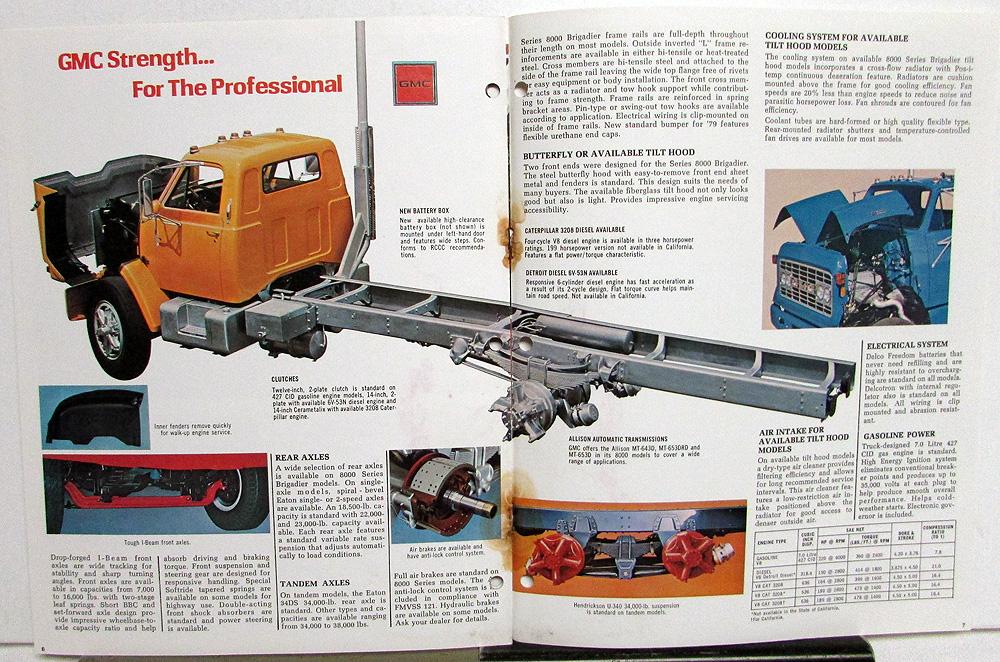 Original GMC sales brochure for the 8000 Series-Brigadier. Read about cab and comfort, contruction, instrument panel, axles, engines, hood models, accessories and options, and more. The staples are rusted away leaving the pages loose and minor stains [see photos]. The spine has holes punched for a binder. ADV 79-14