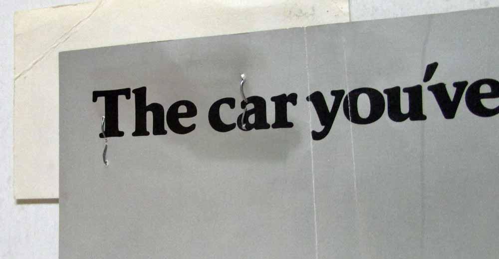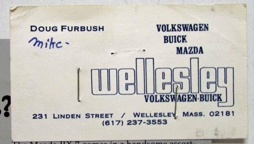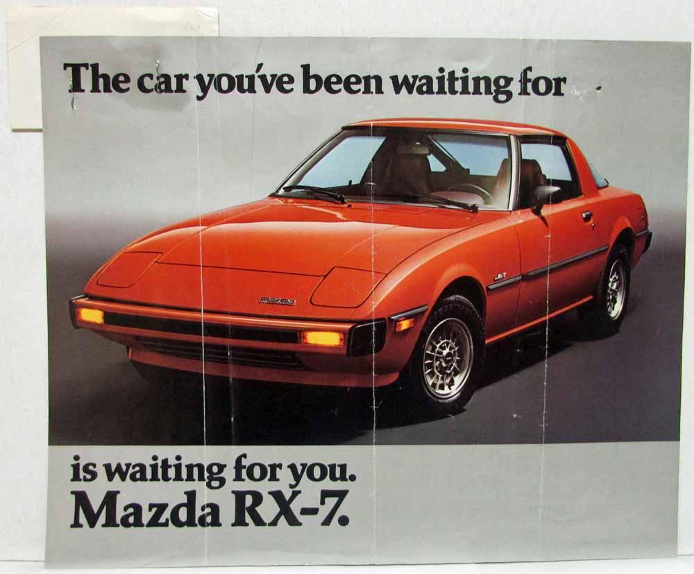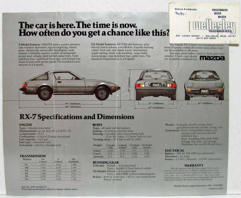 1979 Mazda RX-7 Spec Sheet with Business Car. The car you've been waiting for is waiting for you. Mazda RX-7. Condition: Various issues. Some staining in upper left-hand corner. Creases from being folded. Staples from business card. Name written in ink on business card. Staple holes from a removed staple upper right-hand side.