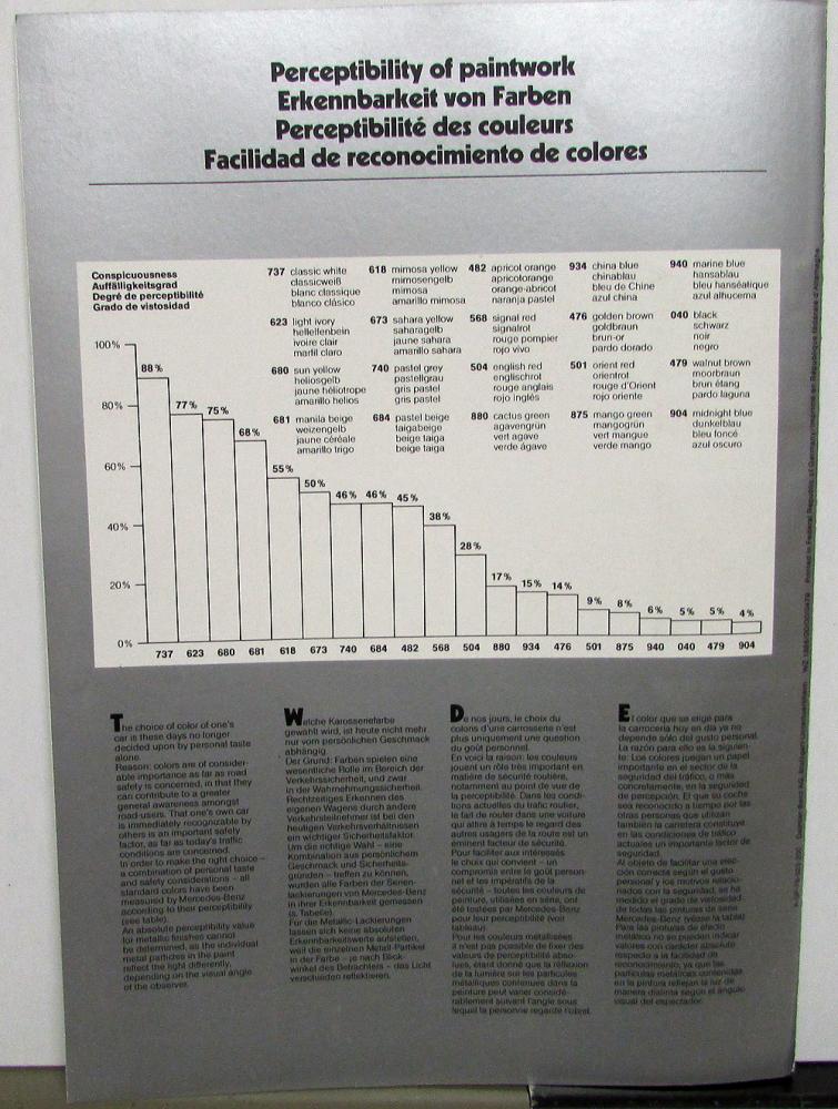 Original 1979 Mercedes-Benz Dealer Sales Brochure. This Multi-Language Text Brochure highlts the Standard and Metallic Paint Chip Samples for the Exterior Color Options. It is in good condition with minor wear and blemishing [see photos].