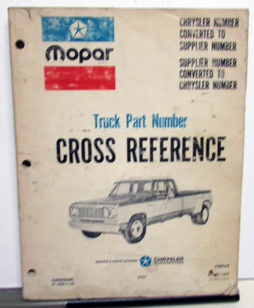 1979 Dodge Truck Dealer Part Number Cross Reference Book. This Book gives Chrysler Number converted to Supplier Number and the other way around. Very useful tool for the Dodge Truck Enthusiast or Collector. Good condition with minor wear and soiling [see photos].