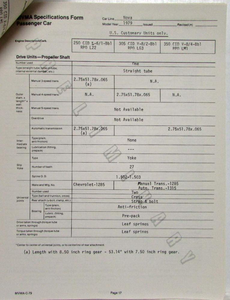 1979 MVMA Preliminary Specifications Form Passenger Car. Original.