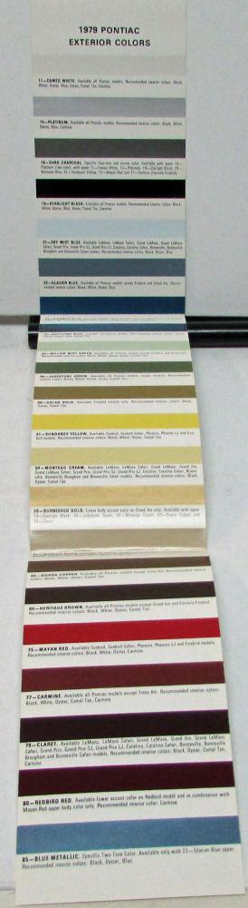 Original 1979 Pontiac Dealer Sales Brochure. This Brochure shows Paint Chips and Cordova Top Options. Very rare and informative piece of automotive history that will display well.