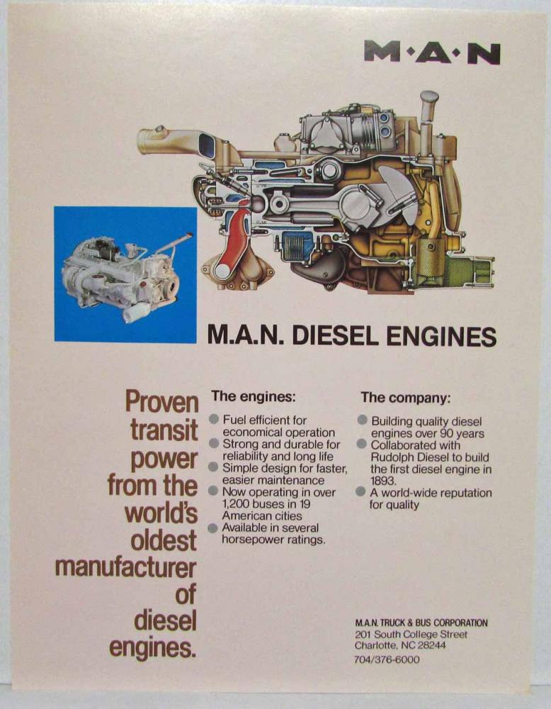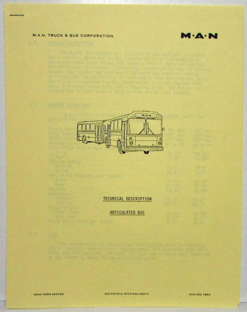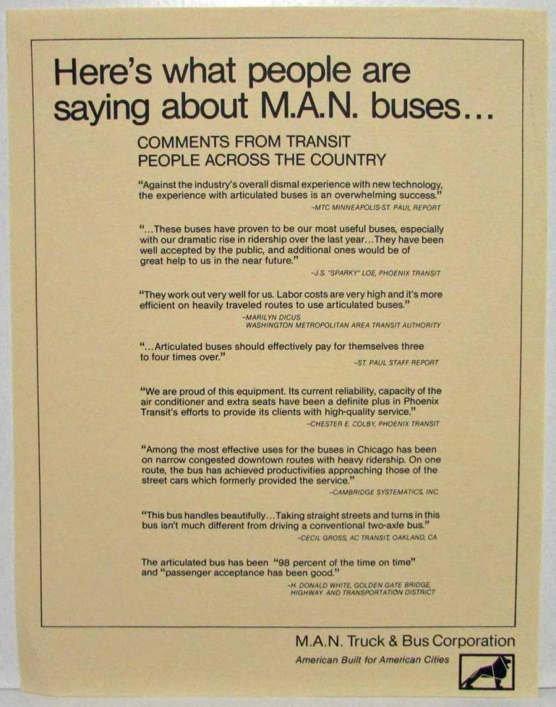 1980-1985 MAN Bus Sales Sheets and Technical Description Bundle. Sheets: 1. MAN - Qaulity means extraordinary availability. 2. MAN - Proven in transit systems across the USA. 3. MAN - Service philosophy sets us apart. 4. Proven in Nation's Capital. 5. Testimonials. 6. MAN - MAN Diesel Engines. 7. Photo Sheet. Condition: Upper right-hand corner bent on testimonials page. See pics.
