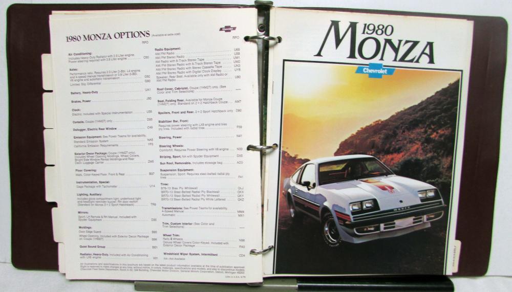Original 1980 Chevrolet Fleet Buyers Guide. This gives detailed product information, specifications, and visuals in a format that can be used to educate customers during sales consultations or to order. Included are paint chip key ring, ordering codes, features, seat styles, highlights, and much more for the Monte Carlo, Malibu, Camaro, Citation, Monza, Chevette. This item is in good condition, with minimal discoloration and minor damage, see photos for reference. This is a great item and a must-have for any automotive collector!