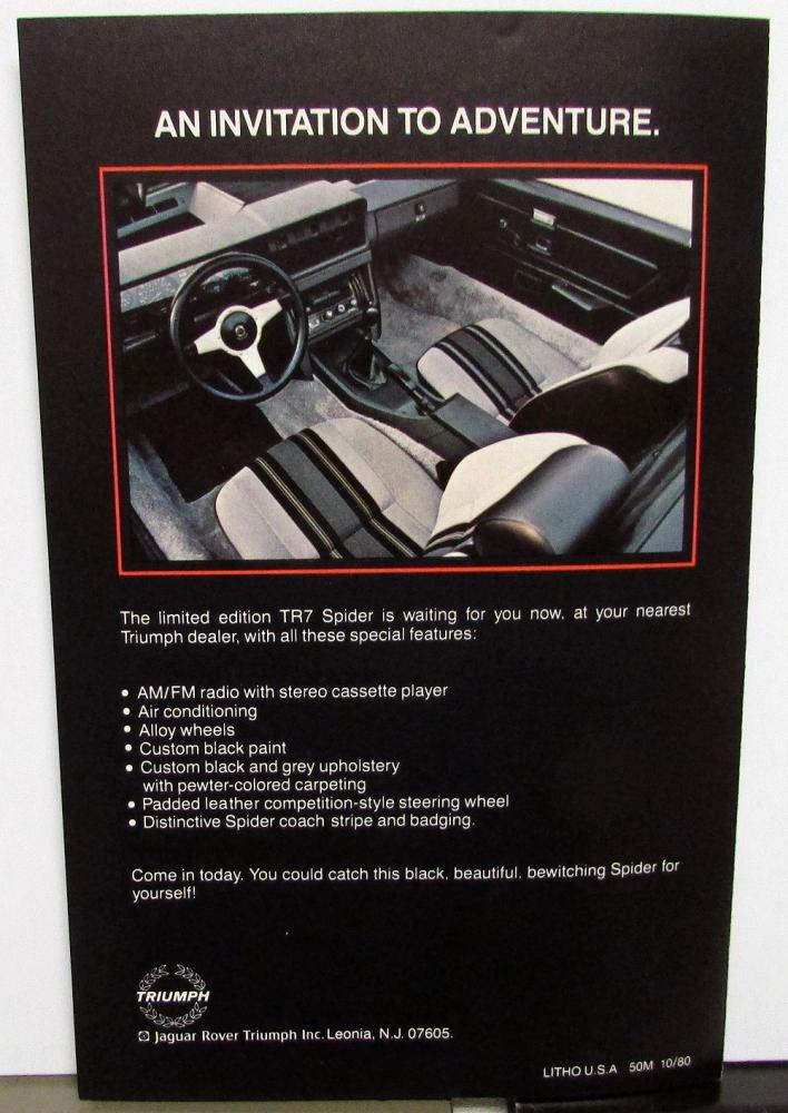 Original 1980 Triumph TR7 Spider Dealer Sales Brochure. This small Folder highlights the new Spider Model. It is in very good condition with minor wear [see photos].