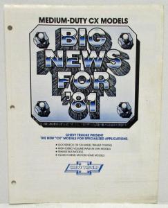 1982 Chevrolet Truck Preliminary Product Info for Dealers Salesman. 3 pieces. 1. Letter to Dealers regarding CX Medium Duty Trucks. 2. CX Medium-Duty Trucks Folder. 3. 1982 Chevy Trucks Preliminary Product Information Book April 1981. CONFIDENTIAL: For Chevrolet Dealers and Salepersons Only. Contents of Book: S10 Pickups. LUV Series. El Camino. C/K Pickups. Chassis-Cab. Blazer. Suburban. Sportvan. Chevy Van. Hi-Cube & Cutaway Van. Step-Van. Medium-Duty. Condition: Some soiling/yellowing. See pics.