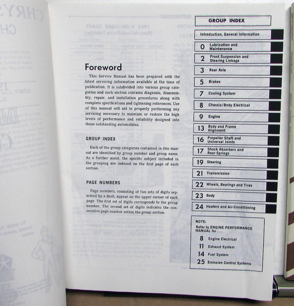 Original 1982 Chrysler, Dodge, Plymouth Rear Wheel Drive Passenger Cars Dealer Service Manual set. This pair of Shop Manuals is what the Dealer used to service and repair your Diplomat, Mirada, Cordoba, Imperial, New Yorker or Gran Fury Model. It has information, specifications, illustrations, troubleshooting and procedures to aid in repairing these Cars. The Service Manual covers Groups: