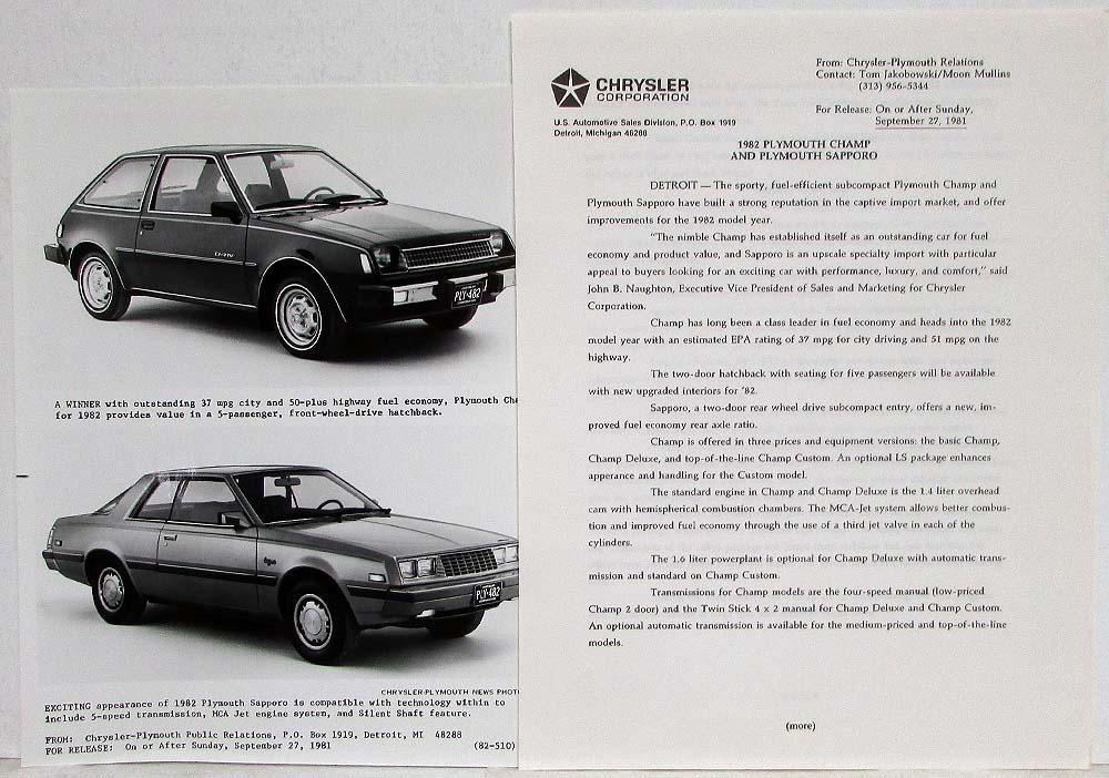 Press Release: 1982 Plymouth Champ and Plymouth Sapporo
