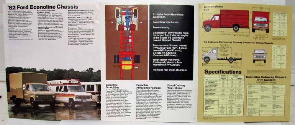 1982 Ford Econoline Van Chassis Sales Folder. More Econoline Vans are on the road today than any other make. Again, in 1981, they're America's best sellers. And Ford Econoline Cutaway models (RV and commercial versions) and Commercial Stripped Chassis models are Econolines offered without bodies so you can install the body of your choice. Also, there is a complete line of Parcel Delivery Vans available. Highlights Econoline School Bus, Econoline Ambulance Package and Parcel Delivery Van Options. Includes dimensions and specifications. Condition: Dealer stamp.