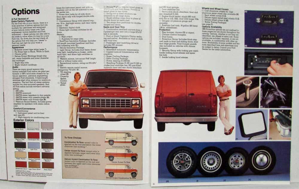 1982 Ford Econoline Van Sales Brochure. '82 Ford Econoline. America's Truck, Built Ford Tough. There are more Econoline Vans on America's roads than any other make. There are many good reasons for that. Econoline Vans are workers, with payload capacitites of up to 2 1/2 tons. Features Econoline XL and Econoline Standard Van. Includes trim content, specifications (E-100, E-150, E-250, E-350), options, colors, Tu-Tone choices, dimensions, and payload package selector.