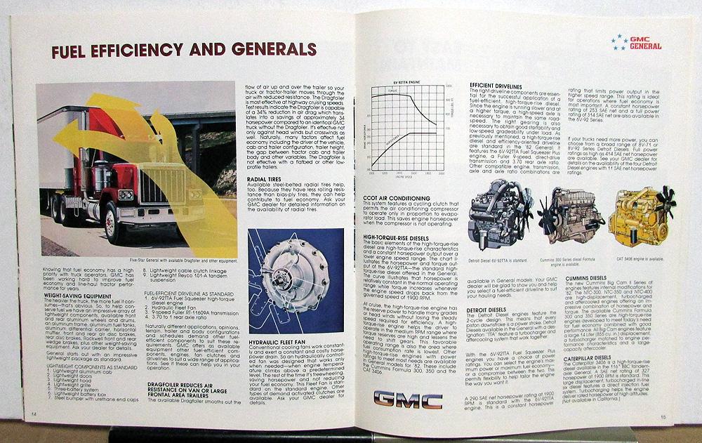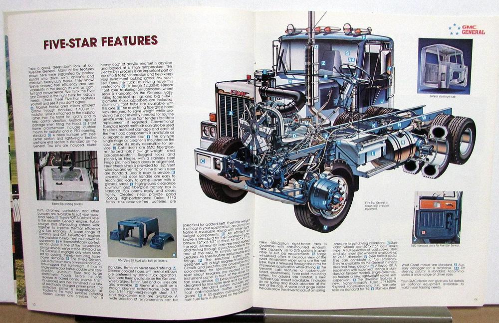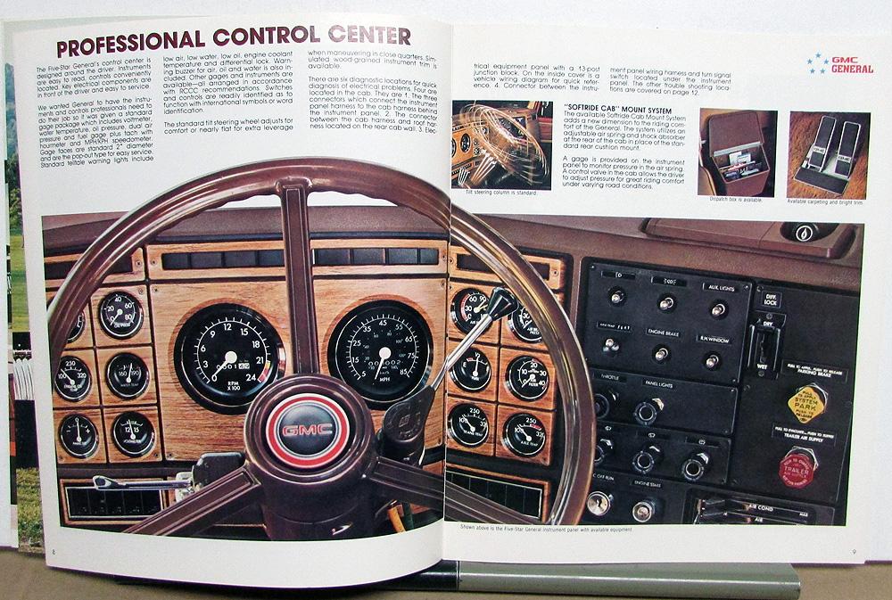 Original 1982 GENERAL & General Models Truck sales brochure. Review photos and descriptions of the various General trucks, including E-Z Spec models. Read about the Classis Long Conventional value. Professional control center. Five-star features. Easy to service. Fuel efficiency, equipment, diesels, Glider kit, and easy to maintain. Color Combinations. Standard operating specifications. Good condition with minor wear and soiling [see photos]. ADV 82-17