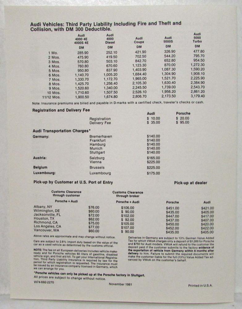 1982 Porsche and Audi European Delivery Program Brochure and Price Sheet.