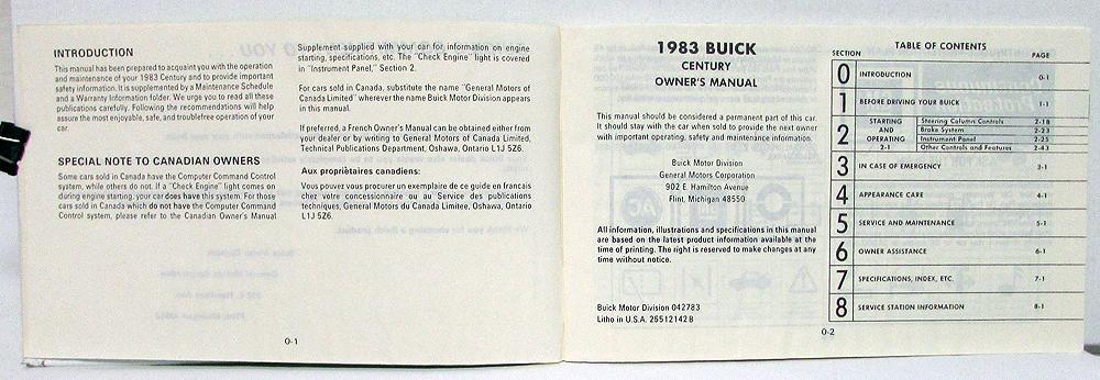 1983 Buick Century Owners Operators Manual Original. This manual contains operation, service/maintenance and general instructions along with illustrations.