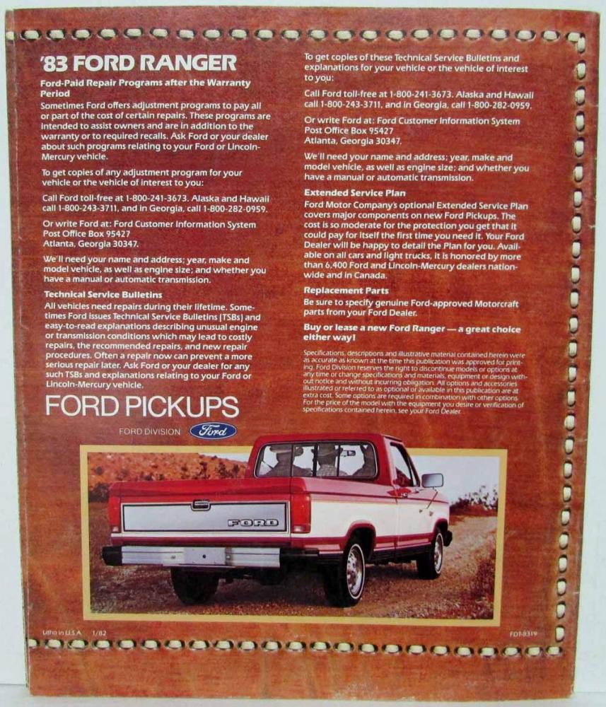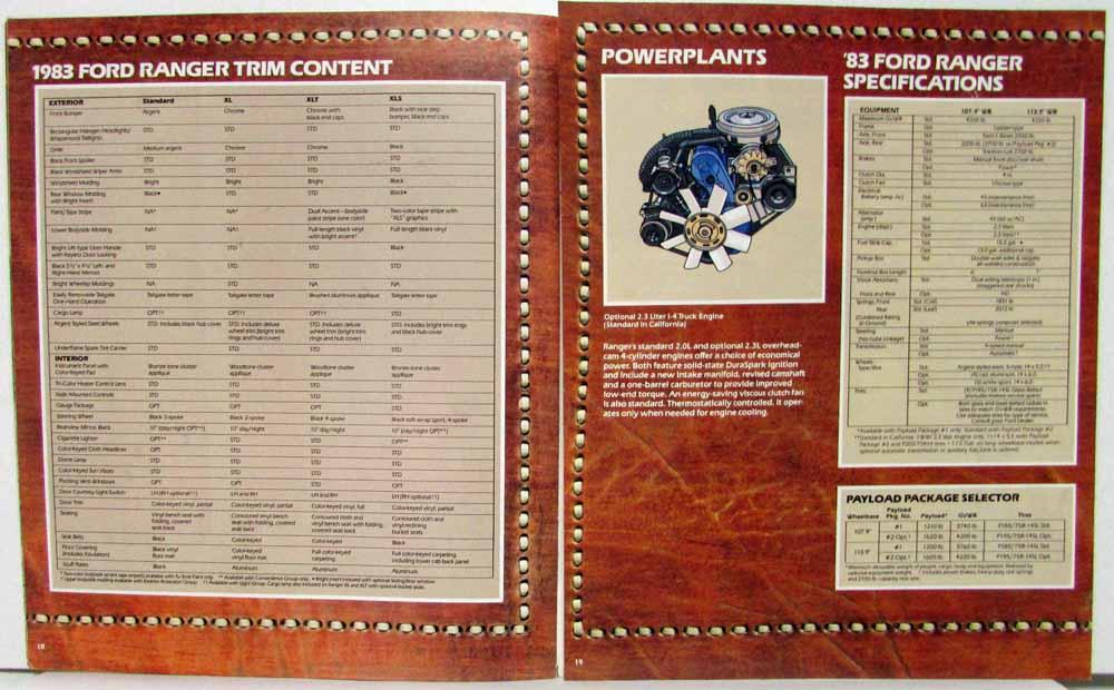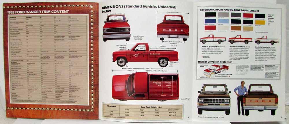 1983 Ford New Ranger Truck Sales Brochure. Announcing a new concept in pickups: The new-size '83 Ford Ranger. Ranger is here! It's the new-size, high-mileage pickup from Ford. Compact on the outside, suprisingly spacious on the inside. The standard bench seat offers room for three. Built like the big ones. Saves like the small ones. Features Ranger XLT, XL, XLS, and Standard Ranger. Includes Ranger options, Trim Content, Dimensions, Colors and Tu-Tone Paint Schemes and Specifications.