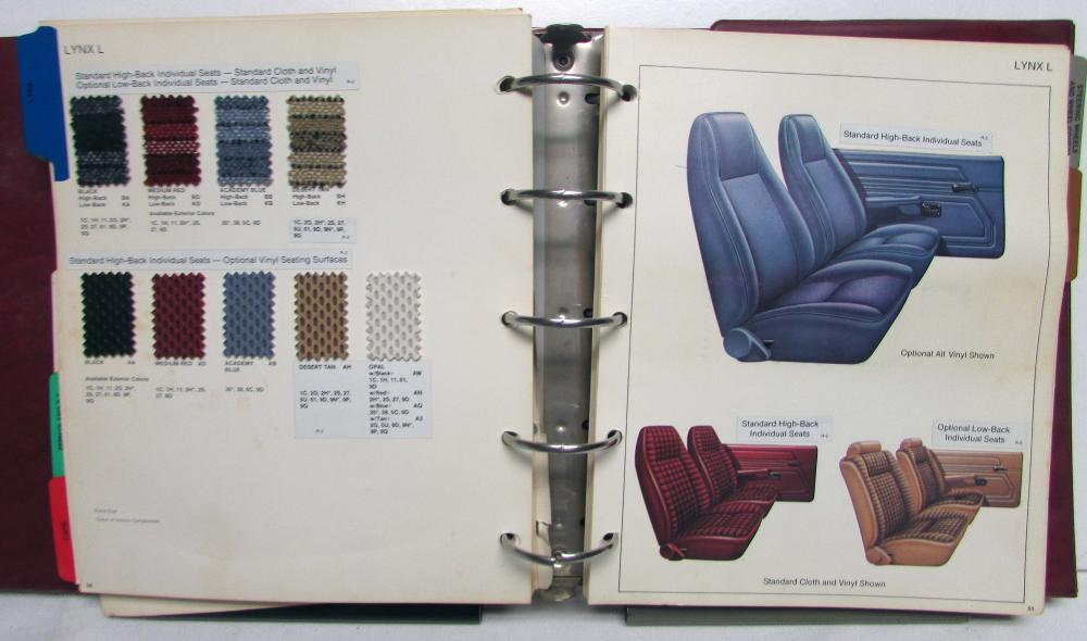 This is an original 1983 Mercury Color & Upholstery Selections Album. It is in good condition and was put together to be an easy access resource of information for the salesmen to use when helping a customer place an order, answering their questions, or just help promote the line. Included are seating options, cloth samples, vinyl samples, and more for the Marquis, Cougar, Capri, Zephyr, Lynx, Colony Park, and LN7.