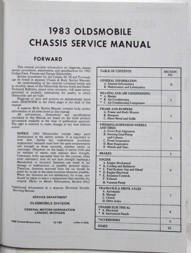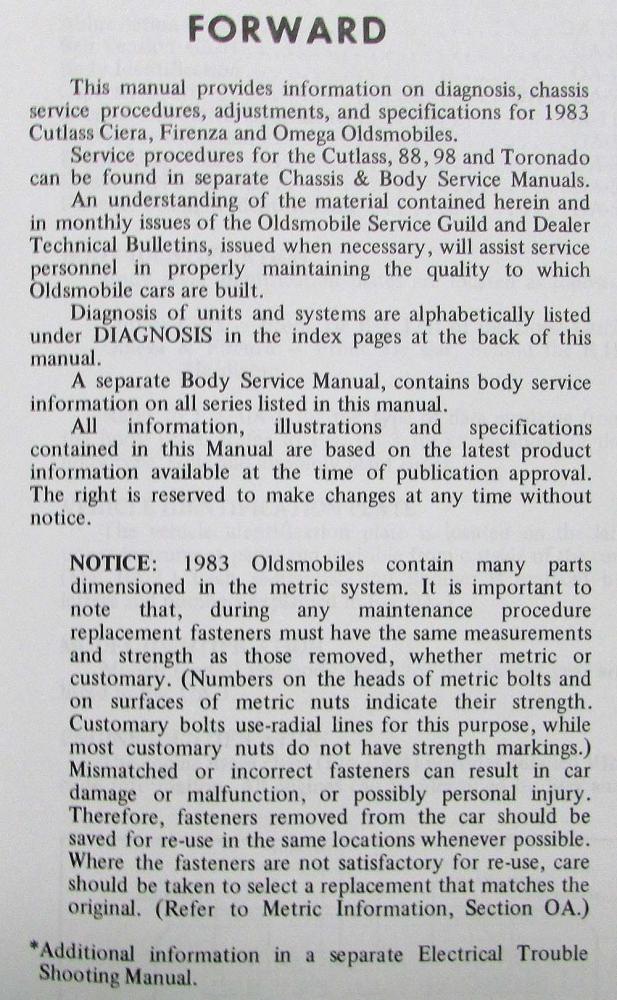 This manual provides information on the diagnosis, chassis service procedures, adjustments, and specifications for 1983 Cutlass Ciera, Firenza and Omega Oldsmobiles.