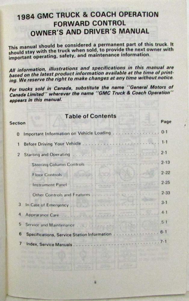 1984 GMC Truck Forward Control Chassis Models Owner's and Driver's Manual. US/Canada. Original.