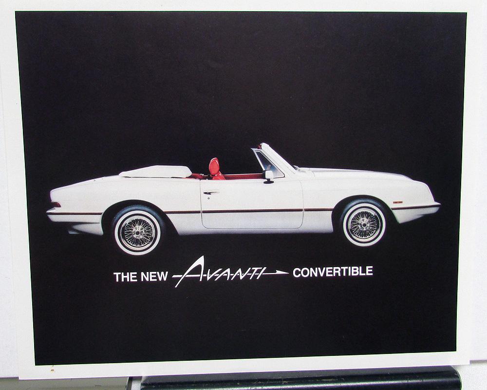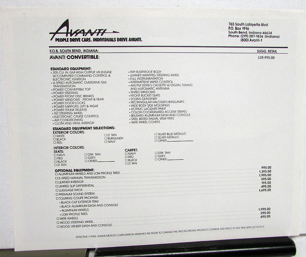 Original data sheet for the 1985 Avanti Convertible. Back side list standard equipment, exterior color choices, interior colors for seats and carpet, and optional equipment with prices. Very good condition.