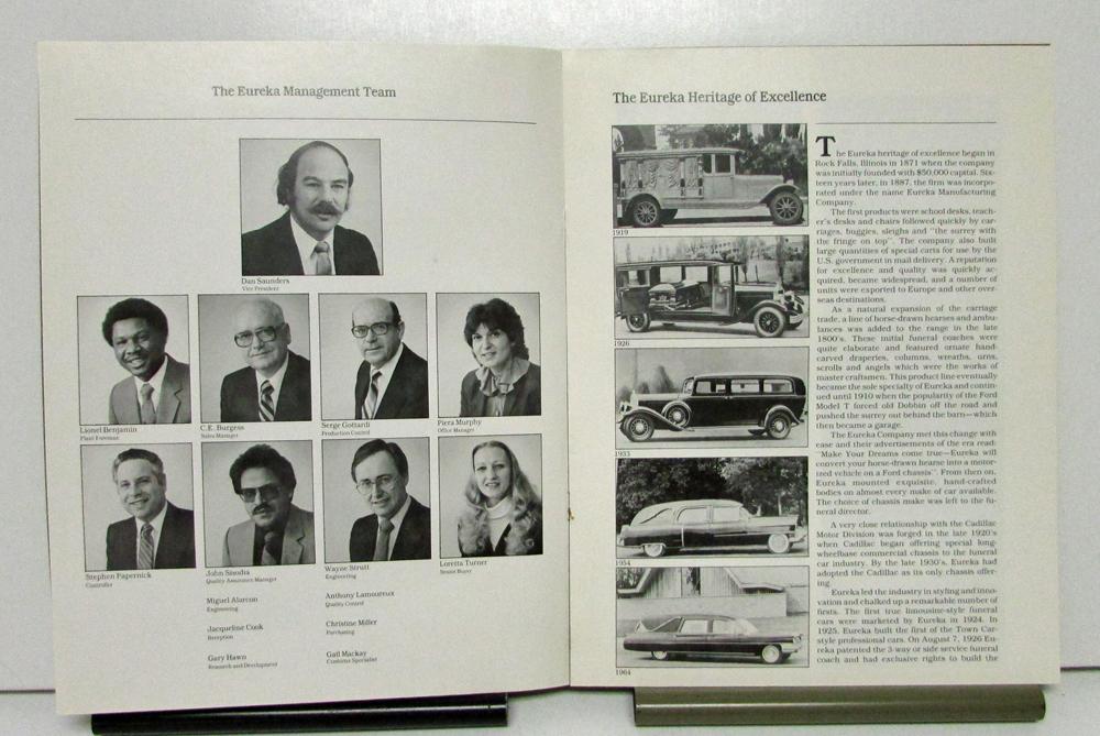1985 Cadillac Eureka Coach Limousine Hearse Canada Histroy Brochure. This brochure has some of the history around the Eureka company and includes pictures of some of its past cars, of the then management staff, manufacturing history, and other information about the company. One of the staples has some oxidation.