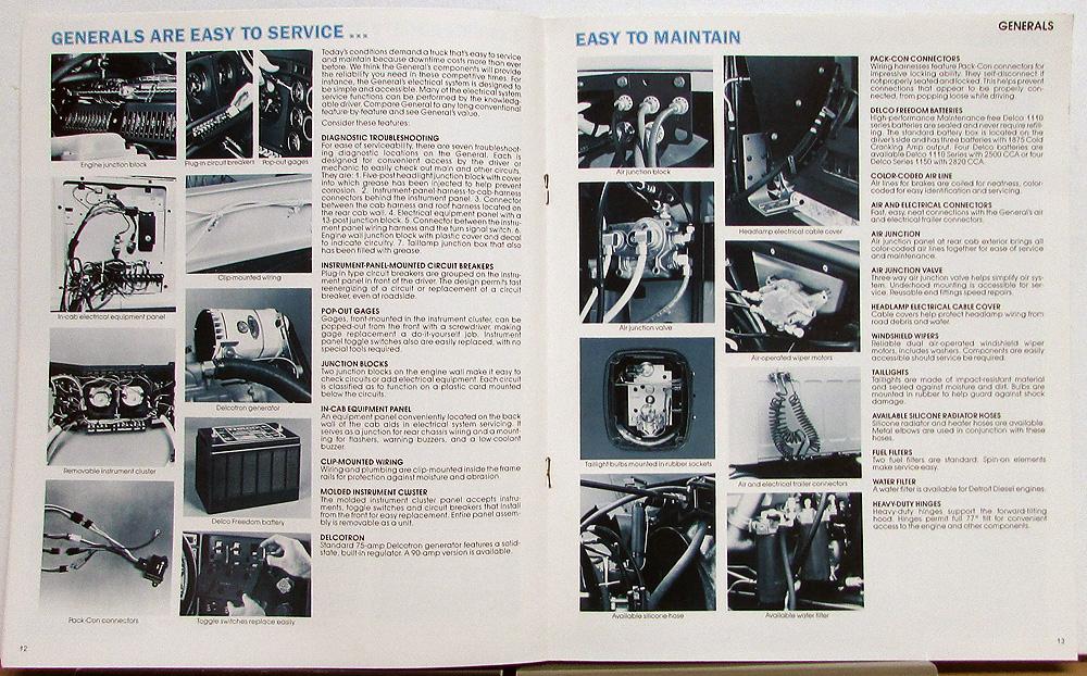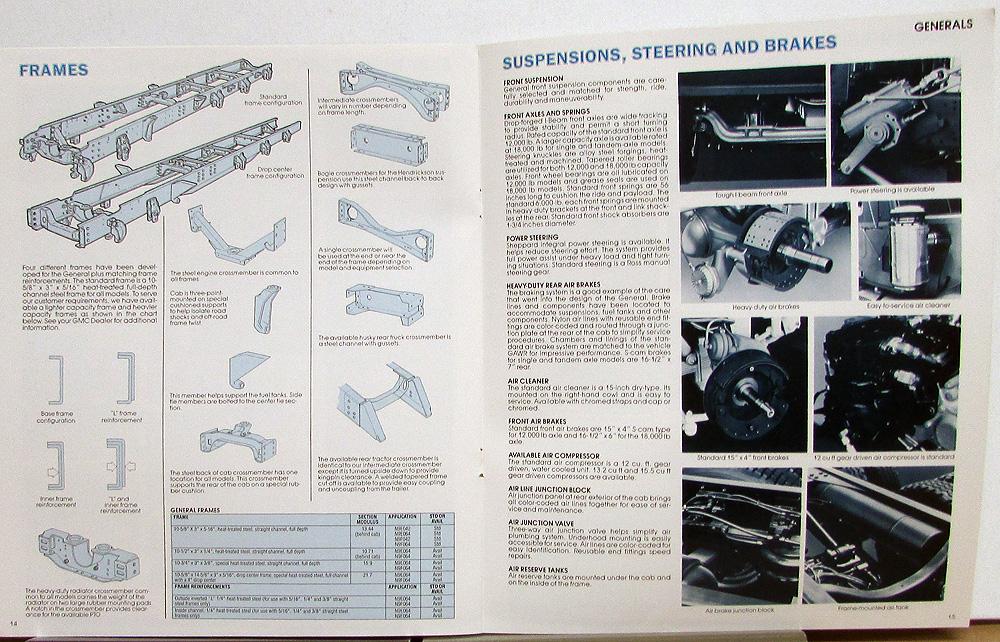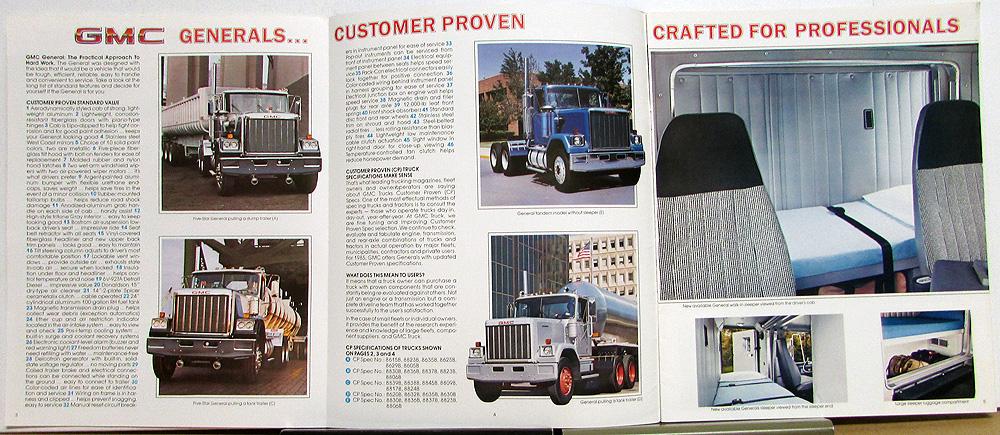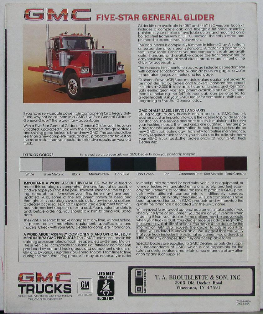 Original 1985 GMC General Heavy Hauling Truck sales brochure. Read about standard value, specifications, comfort, design and construction, engines, tough cab, serviceability, frames, steering and brakes, and much more. Charts and photos. Exterior colors are shown on back cover. There is a dealer sticker on the back cover. Otherwise in good, clean condition.