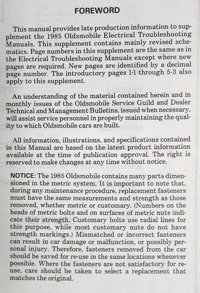 This manual provides late production information to supplement the 1985 Oldsmobile Electrical Troubleshooting Manuals (NOT Included). This supplement contains mainly revised schematics. Page numbers in this supplement are the same as in the Electrical Troubleshooting Manuals (NOT Included) except where new pages are required. New pages are identified by a decimal page number. The introductory pages 1-1 through 5-3 also apply to this supplement.