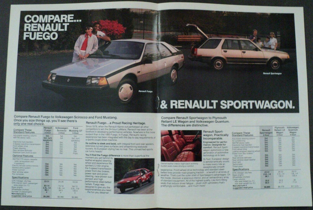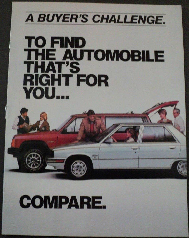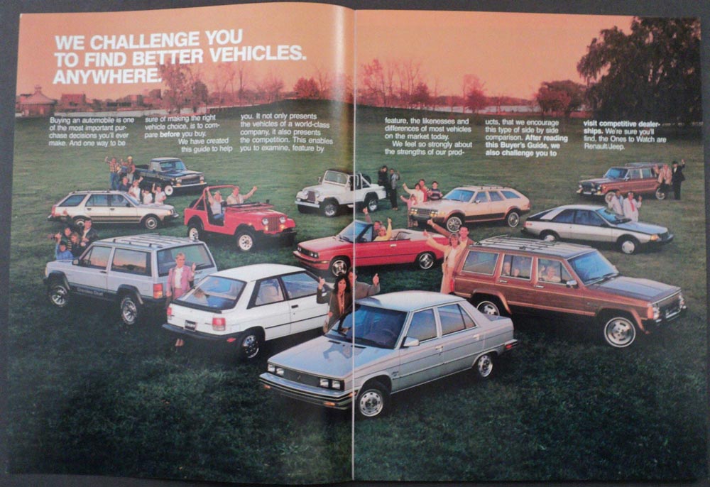 1986 Buyer's Challenge Comparison Brochure Guide to help compare the following: Renault Alliance to Toyota Corolla and Plymouth Horizon, Renault Encore to Ford Escort and Toyota Tercel, Renault Fuego & Sportwagon to Plymouth Reliant and VW Quantum, Jeep Cherokee to Ford Bronco II and Chevy S-10 Blazer, Jeep Wagoneer to Buick Electra and Volvo Turbo, and no comparison needed for the Jeep Grand Wagoneer, American Eagle, and CJ. Measures 8 x 10.75 with 16 pages.