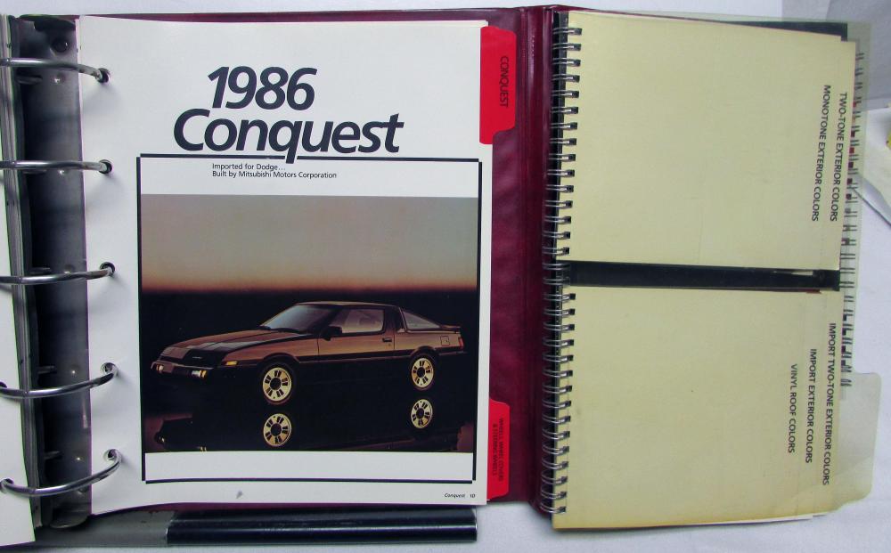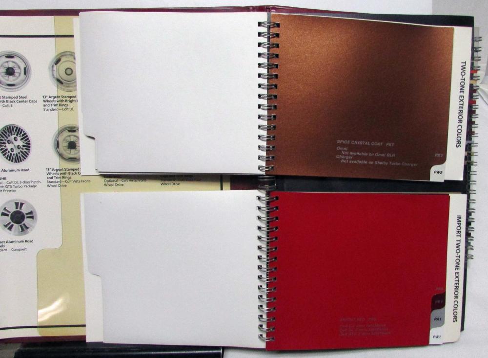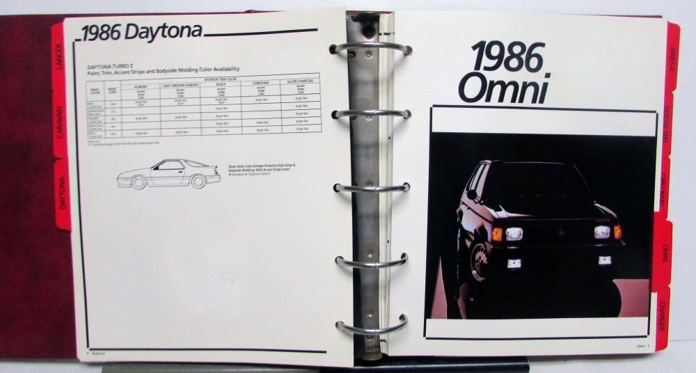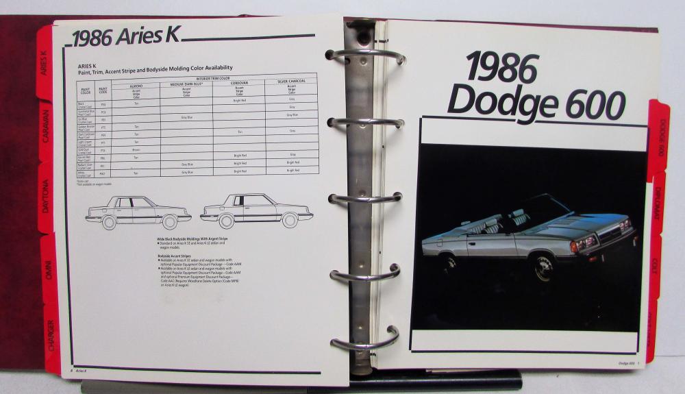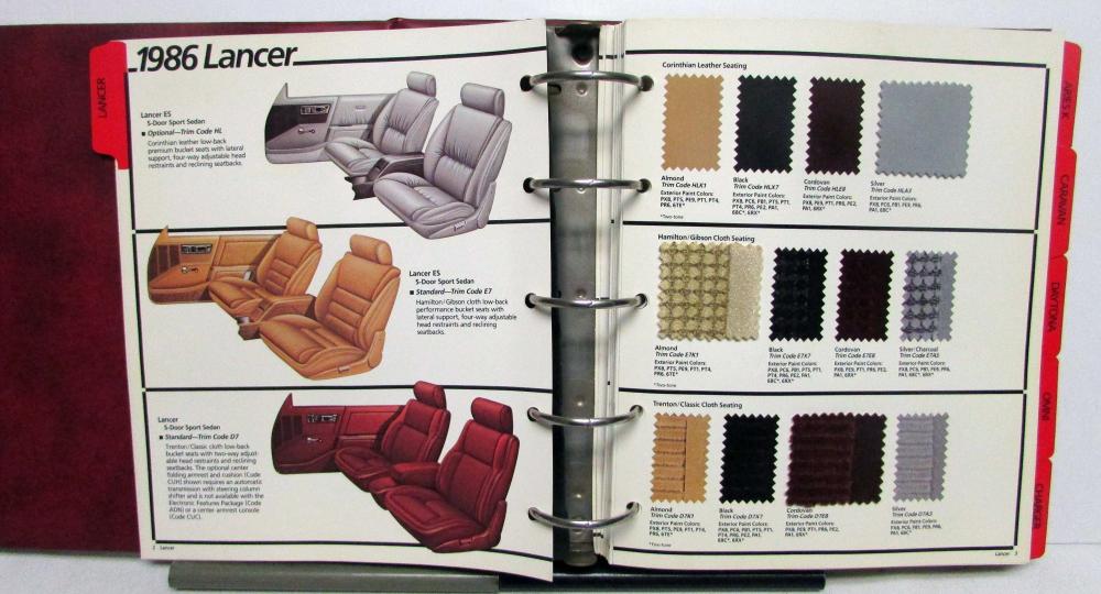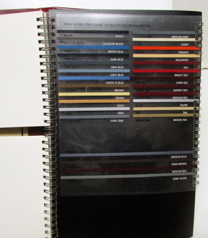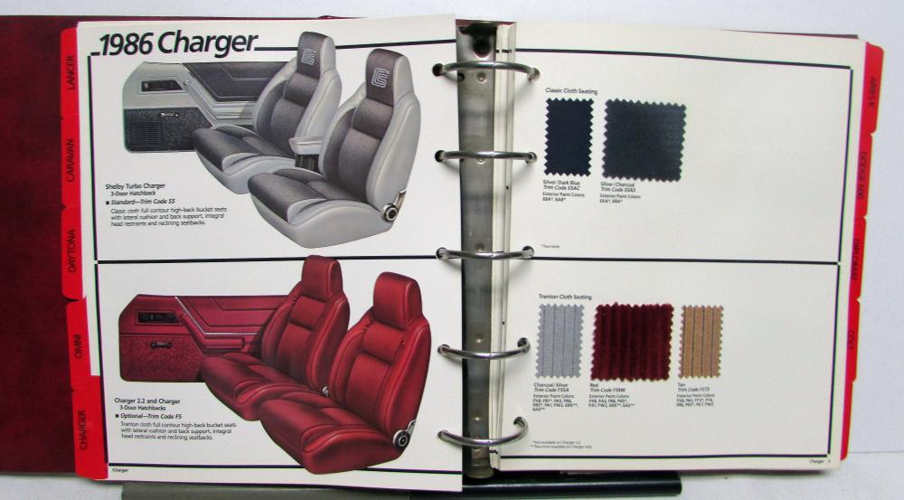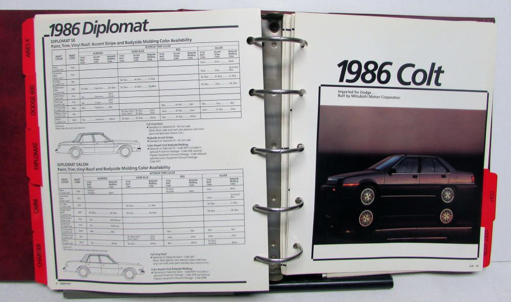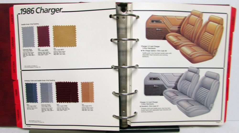 Original 1986 Dodge Color & Trim Selections Album. This gives detailed seating options, cloth samples, vinyl samples, ordering codes, and much more to make it easy for the salesmen to help the customer place their orders or just view all of their options in one easy-to-use album. This covers all the selections for the Lancer, Caravan, Daytona, Omni, Charger, Aries K, Dodge 600, Diplomat, Colt, Colt Vista, and Conquest. This album is in good condition, however, does have some minor wear and discoloration from the years of use, see photos for reference. This is a great album and would make a great addition to any collection!