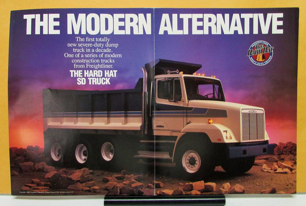 1986 Freightliner Truck "The Modern Alternative" Sales Brochure. When folded out there is a really nice picture of "The Hard Hat SD Truck" and states "The first totally new severe-duty dump truck in a decade. One of the series of modern contruction trucks from Freightliner".