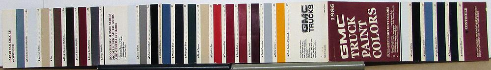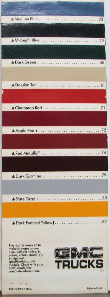 Original 1986 GMC FULL LINE truck paint color folder. Two-sided printing on cardstock. When opened it measures 3.35 x 27 inches. Except for staple holes on top of the folder, it is in very good condition. TSP 7819-86