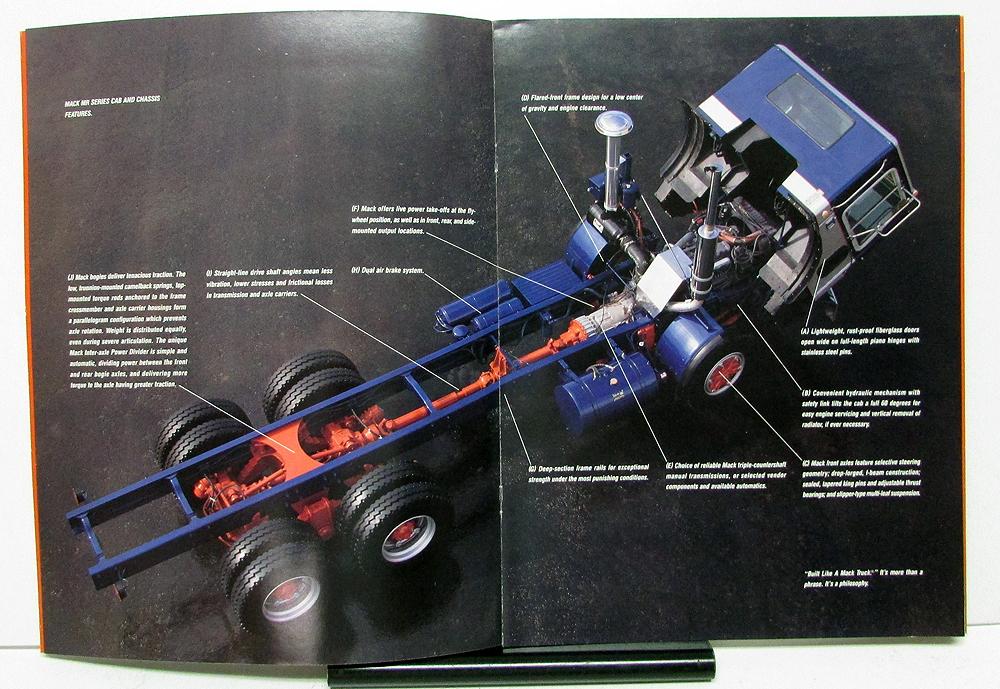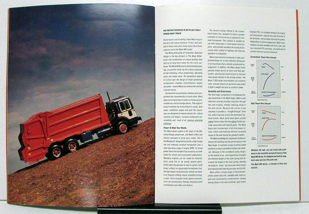 1986 Mack Truck Series MR Sales Brochure & Specifications. The front page has a nice picture of a Mack MR Series truck. The inside page have more pictures of the MR truck and describes various features. One of the last pages has information on specifications.