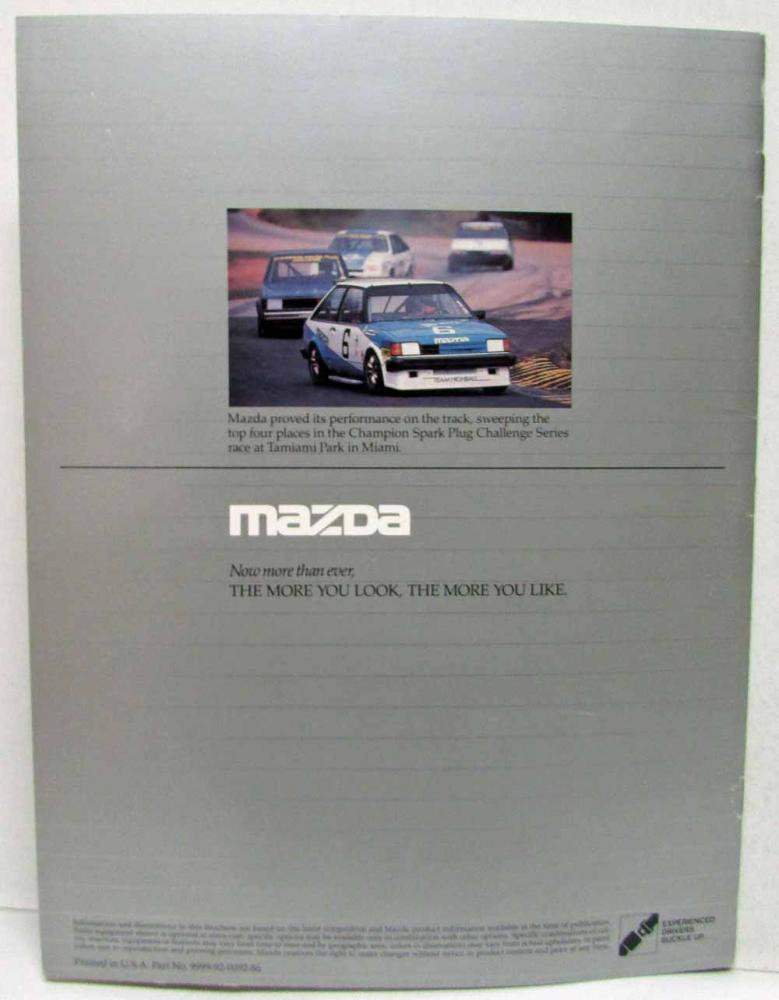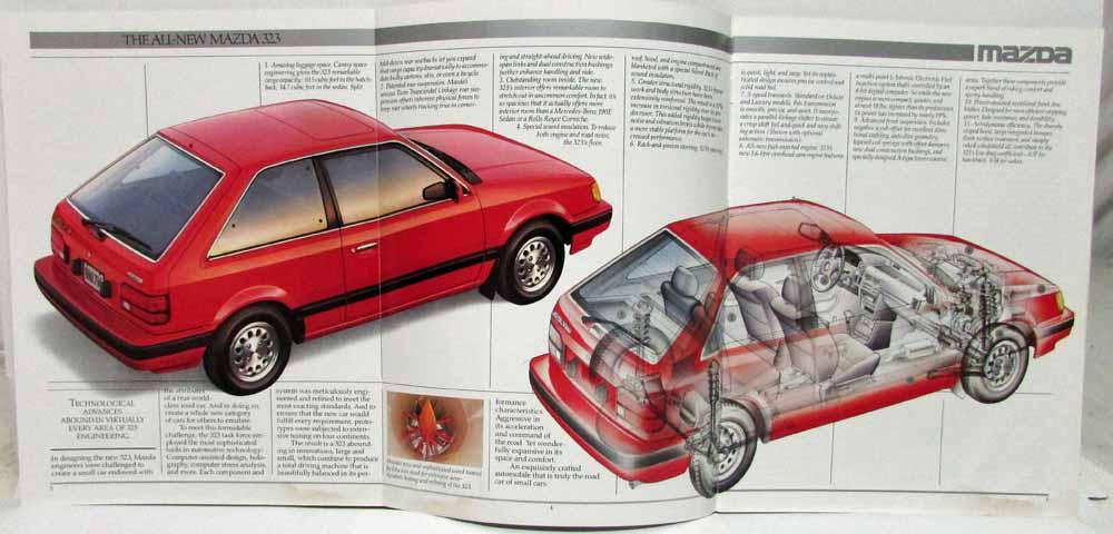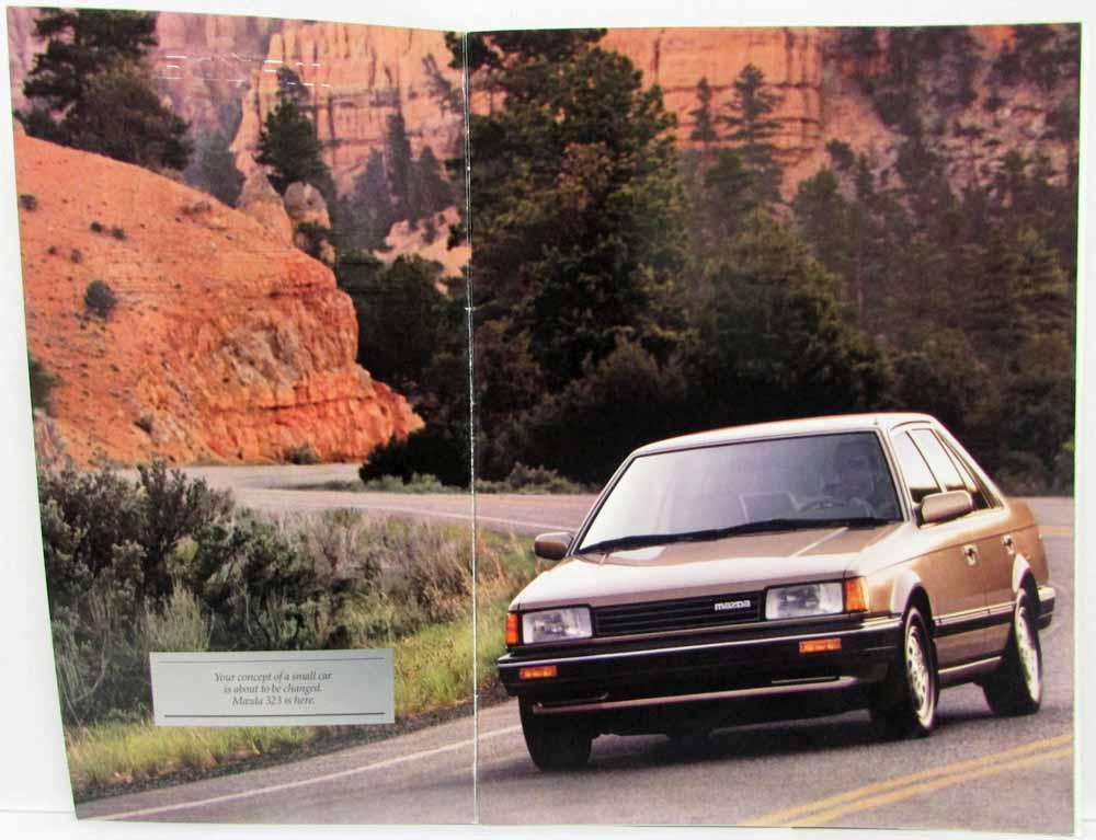 1986 Mazda 323 Sales Brochure. Your concept of a small car is about to be changed. Mazda 323 is here. Contents: The all-new Mazda 323. Engineering. 323 Luxury Sedan. 323 Luxury Interiors. 323 Deluxe Sedan. 323 Deluxe Interiors. 323 Luxury and Deluxe Hatchbacks. Finish Line Accessories. Specifications and Features. Condition: Some moisture damage along the bottom of some pages. See pics.