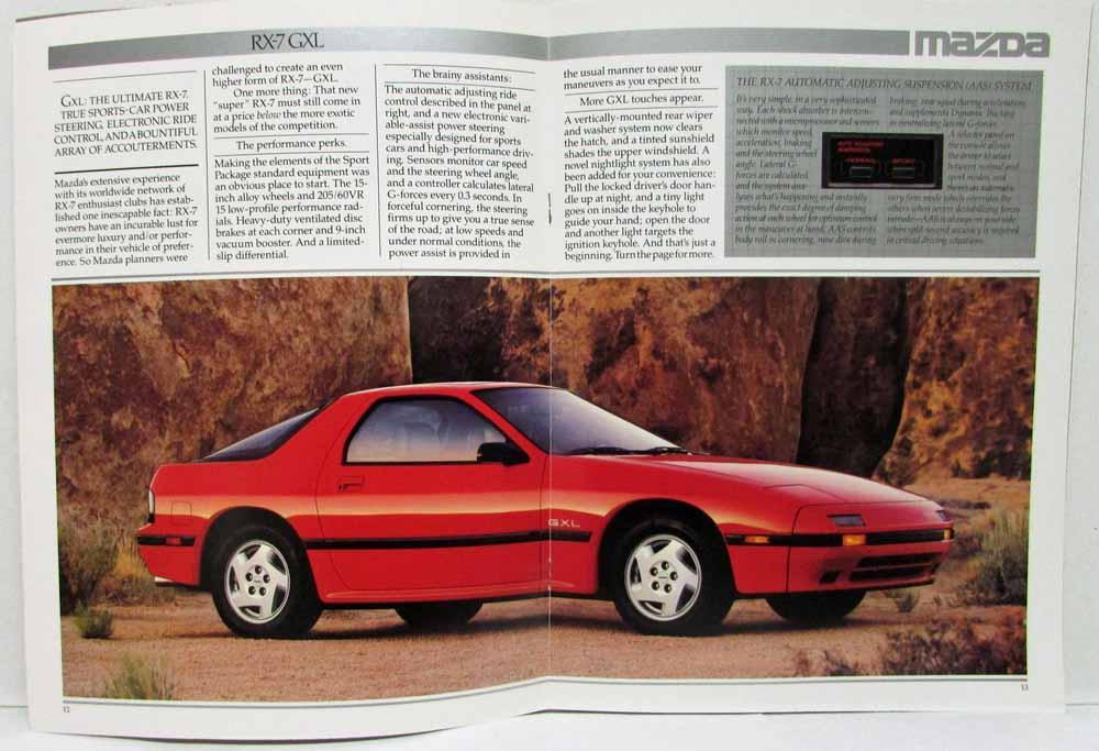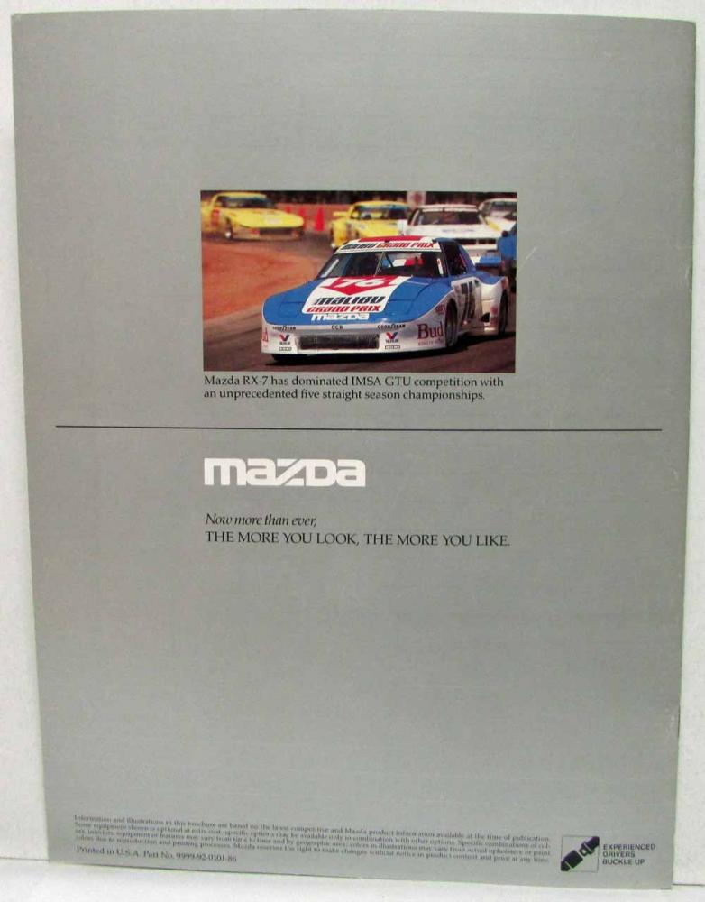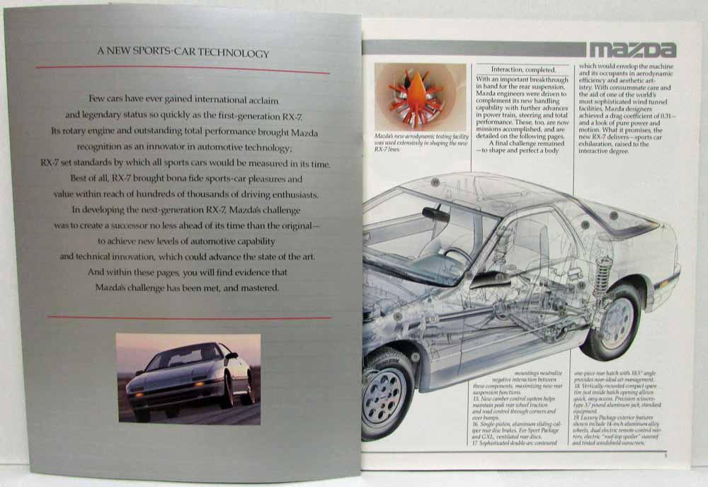 1986 Mazda RX-7 Sales Brochure. Introducing the next-generation RX-7: the legendary rotary rocket unveils new breakthroughs in automotive technology, and a new generation in sports cars begins. In developing the next-generation RX-7, Mazda's challenge was to create a successor no loess ahead of its time than the original - to achieve new levels of automotive capability and technical innovation, which could advance the state of the art. And within these pages, you will find evidence that Mazda's challenge has been met, and mastered.