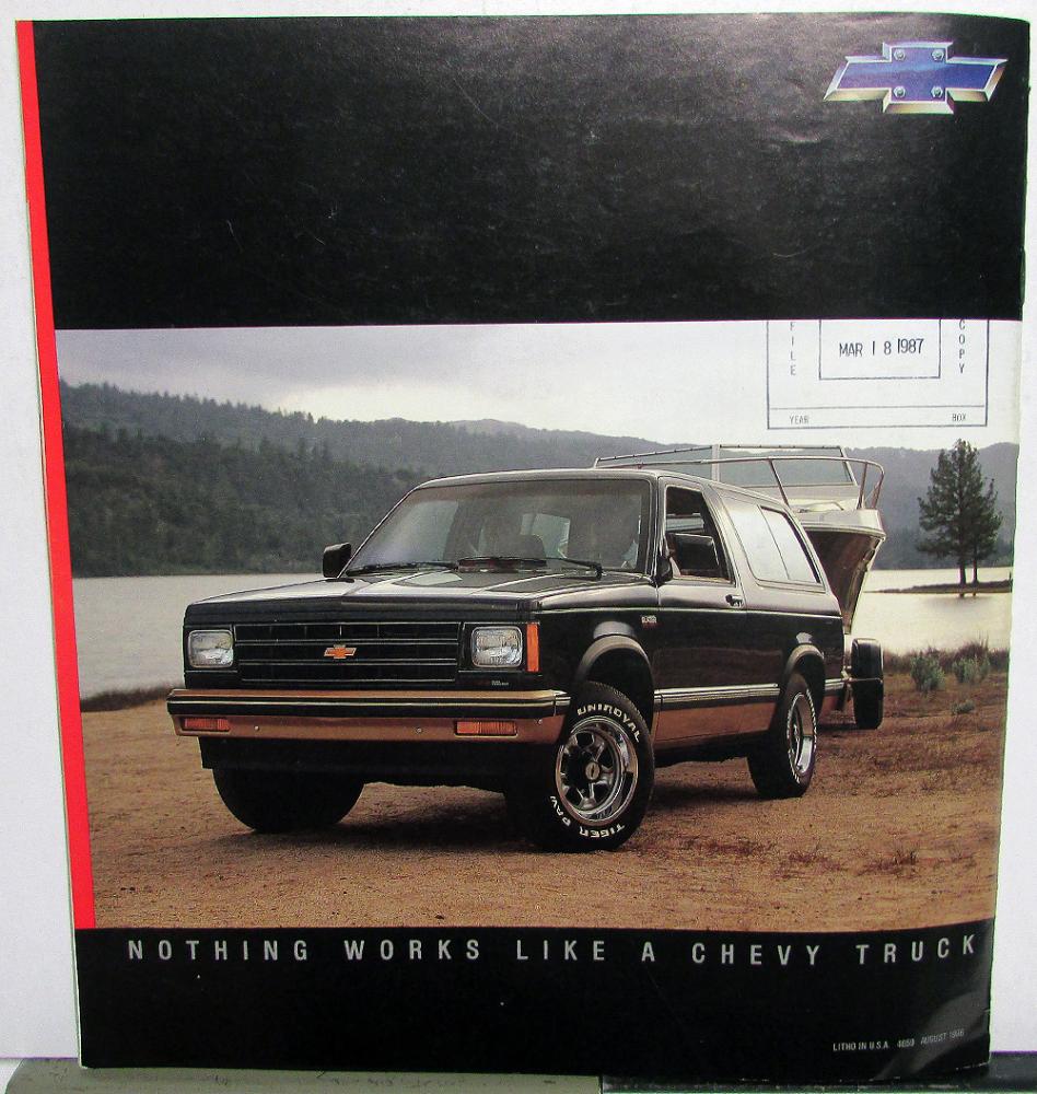 Original 1987 Chevy Dealer Sales Brochure. This large well illustrated Brochure highlights the Features, Options and Specs of the S-10 Blazer Models. Very informative Brochure that is in good condition with minor wear and blemishing. The back cover has a date stamp.
