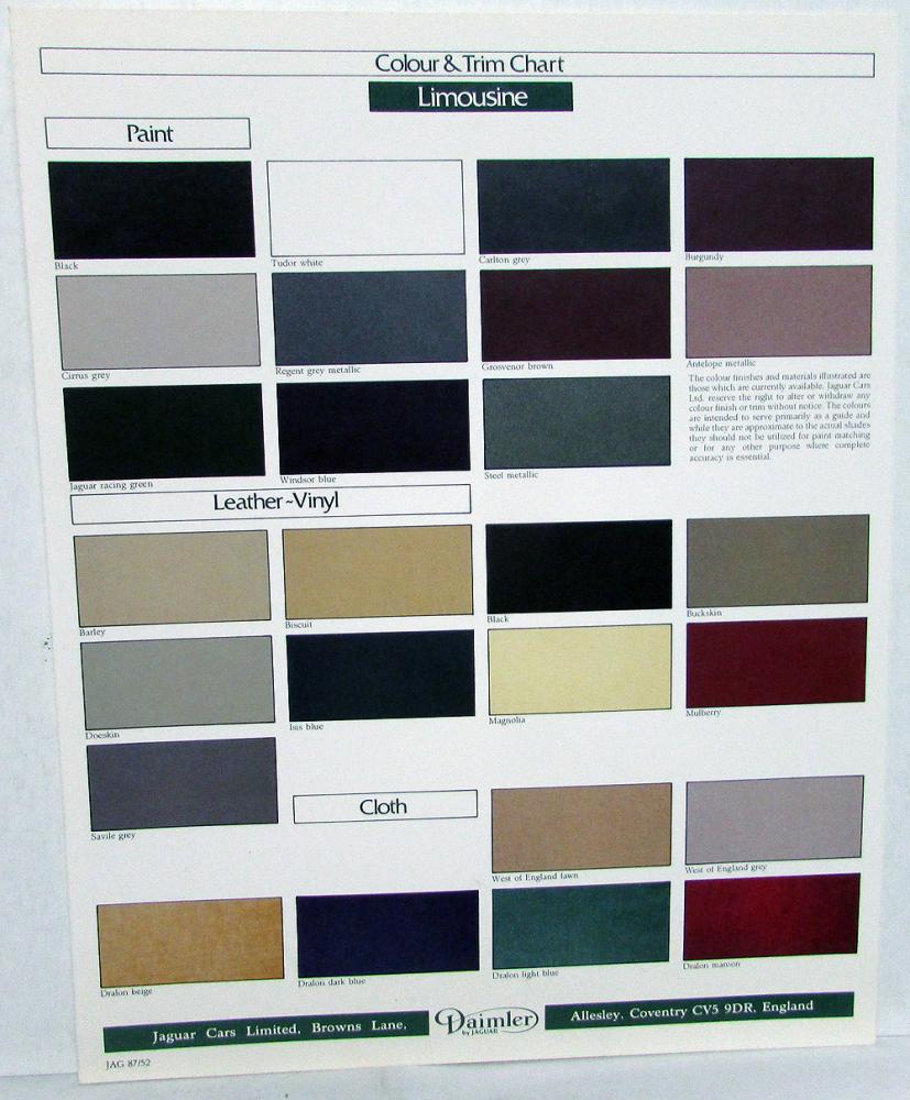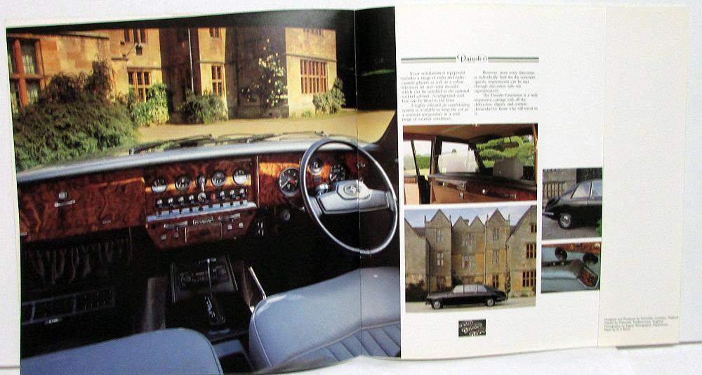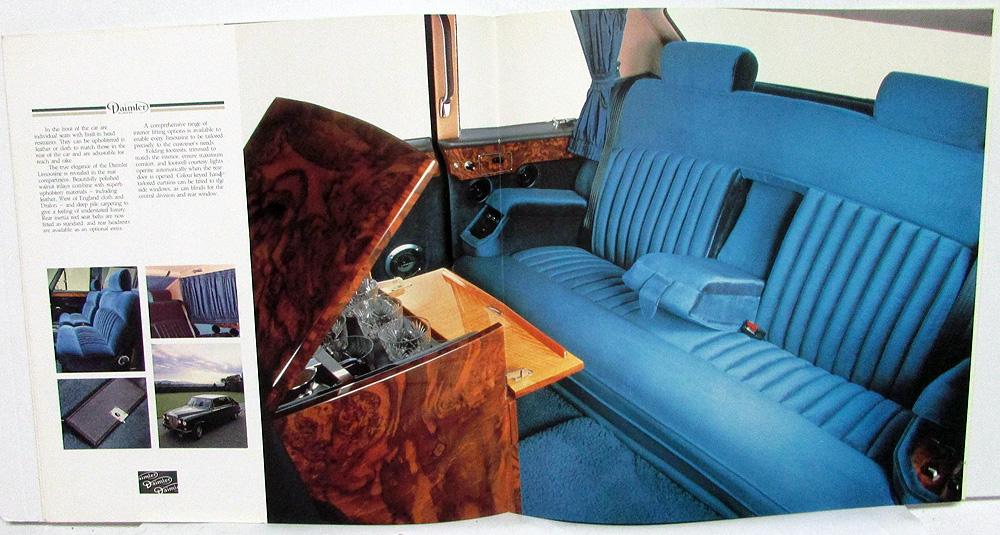 Original 1987 Daimler Limousine Dealer Sales Brochure. This elegant Brochure highlights the Limousine Models offered by Daimler/Jaguar. It includes a Color and Trim Chart. Brochure is in very good condition with minor wear [see photos].