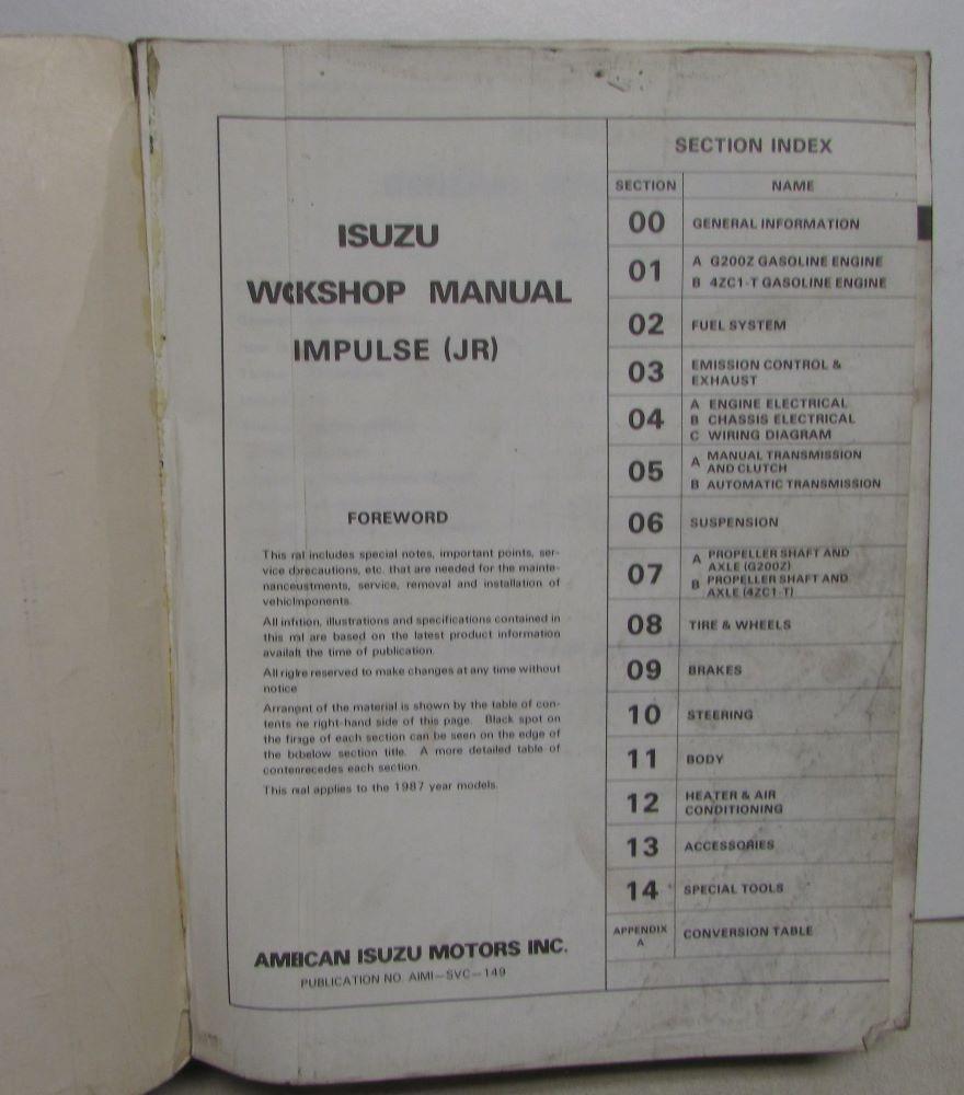1987 Isuzu Impulse (JR) Service Shop Repair Manual. Original.