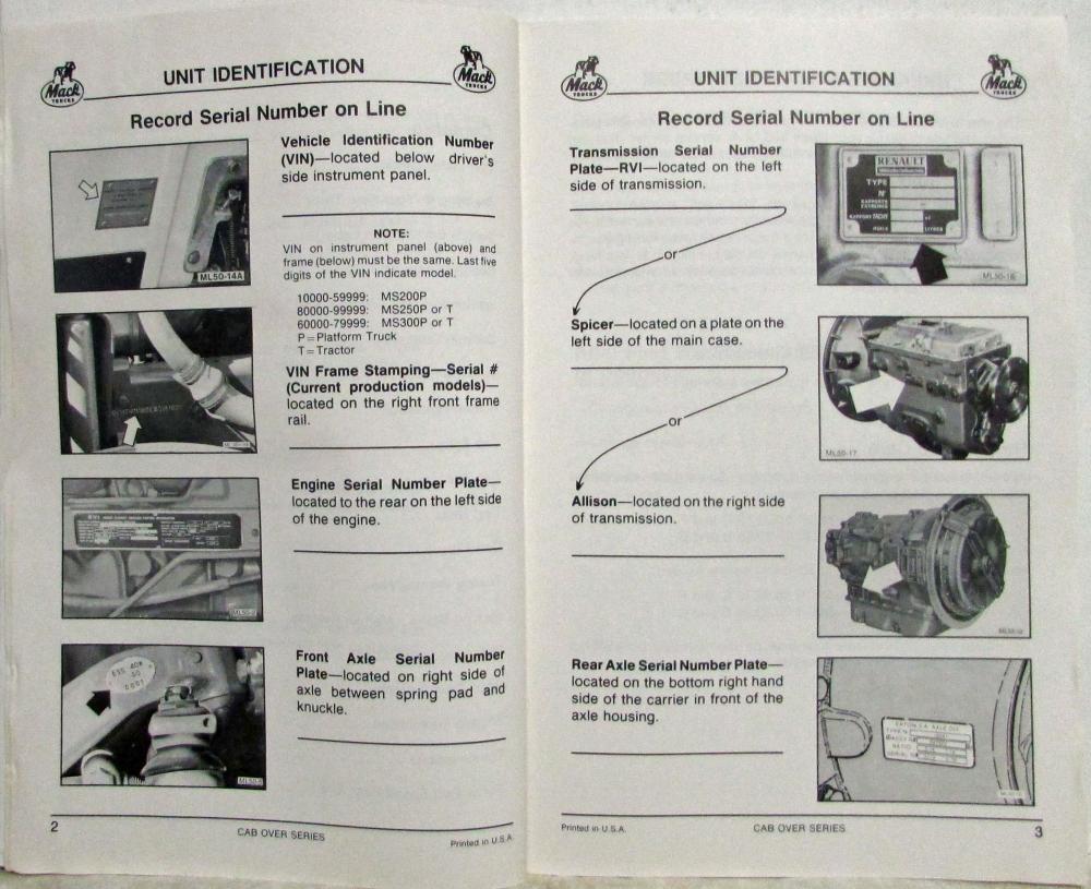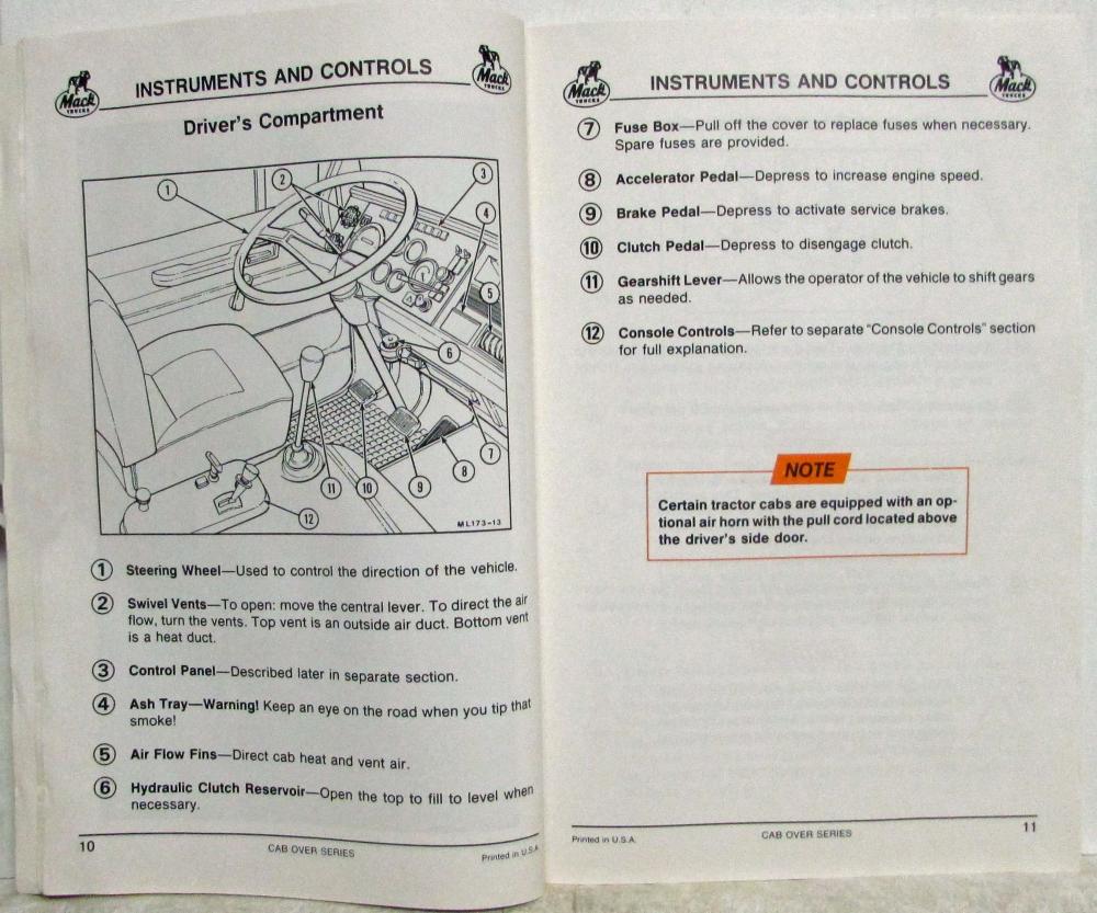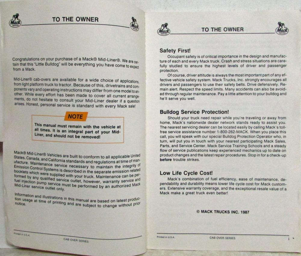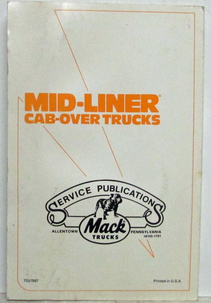 Mack Mid-Liner Cab-Over Trucks Owners Manual. Original. TS579-87 2/87 Printing